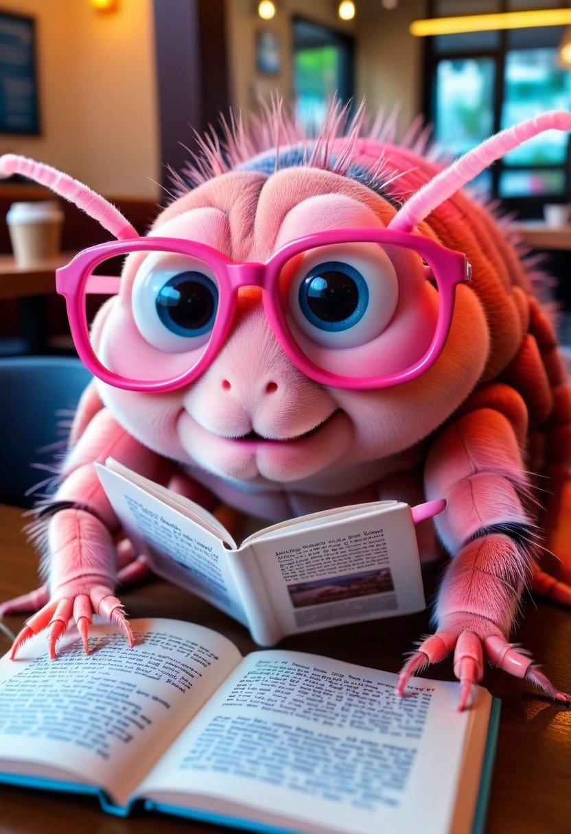 FLUX.1 cinematic style, very cute and kawaii pink cockroach wearing eyeglasses while reading a book and sipping coffee in a cafe, instagram photo,