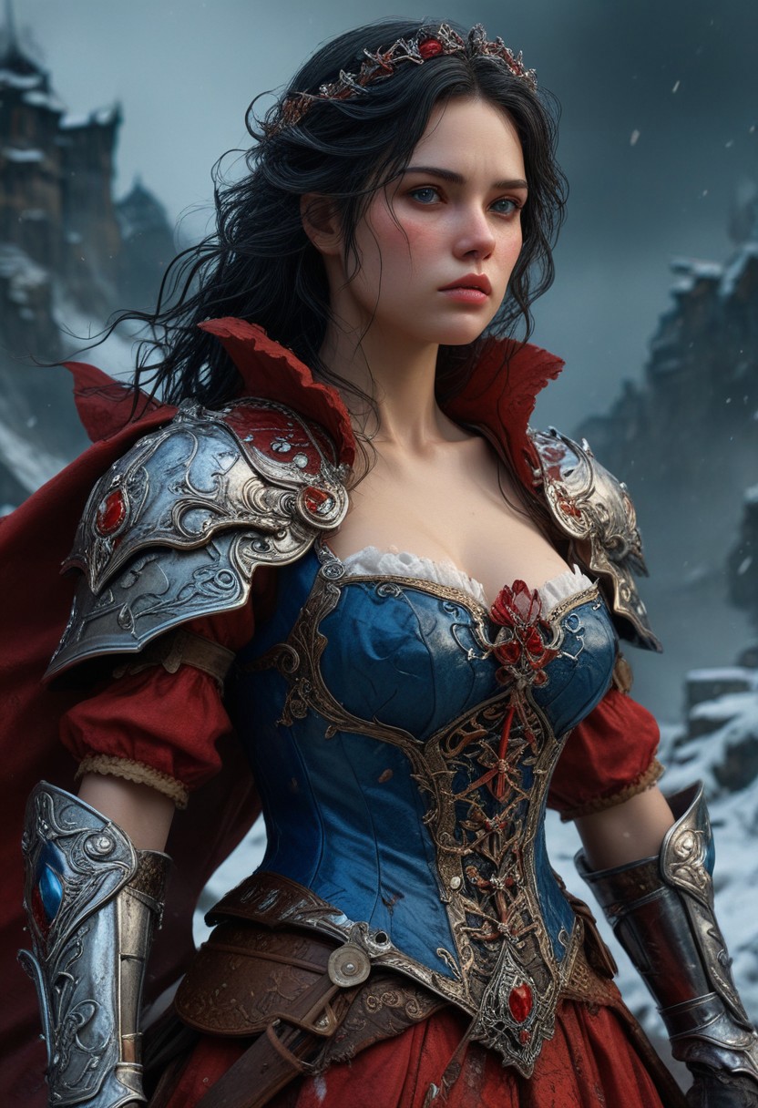 High resolution ultra-realistic of Beautiful Snow White warrior, Fantasy style, 8k, capturing the intensity of the moment, dramatic lighting, standing on a bloody and stormy battlefield in a fighting pose, fire, intricately designed iron armor, red skirt, perfect athletic figure, beautiful Warrior Swow White, fire, dirty face, ultra realistic, cinematic style, athletic figure, dark fantasy, covered in dirty and blood, cinematic colors Lighting, extremely detailed, 8K, wavy black hair, realistic dirty bloody pale face, realistic blue eyes, beautiful Snow White on in cool iron armor, hyper-detailed, hyper-realistic, bright colours, Attractive 21 old years girl, Attractive, beautiful firm Breasts, sharp focus, digital painting, Photograph Taken on Nikon D750, Alphonse Mucha, 8K, athletic figure, Hyperdetailed, hyperrealism, Attractive, Attractive bust girl, asymmetric balance