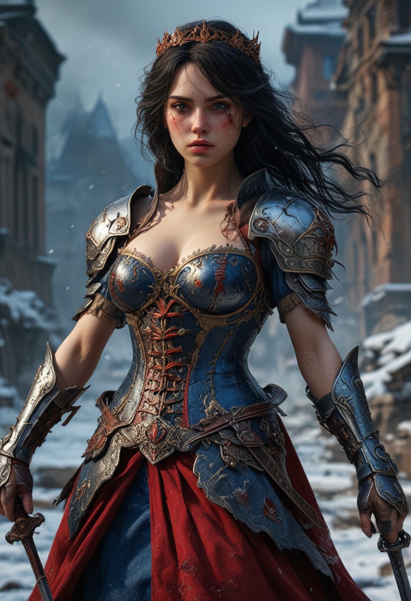 High resolution ultra-realistic of Beautiful Snow White warrior, Fantasy style, 8k, capturing the intensity of the moment, dramatic lighting, standing on a bloody and stormy battlefield in a fighting pose, fire, intricately designed iron armor, red skirt, perfect athletic figure, beautiful Warrior Swow White, fire, dirty face, ultra realistic, cinematic style, athletic figure, dark fantasy, covered in dirty and blood, cinematic colors Lighting, extremely detailed, 8K, wavy black hair, realistic dirty bloody pale face, realistic blue eyes, beautiful Snow White on in cool iron armor, hyper-detailed, hyper-realistic, bright colours, Attractive 21 old years girl, Attractive, beautiful firm Breasts, sharp focus, digital painting, Photograph Taken on Nikon D750, Alphonse Mucha, 8K, athletic figure, Hyperdetailed, hyperrealism, Attractive, Attractive bust girl, asymmetric balance