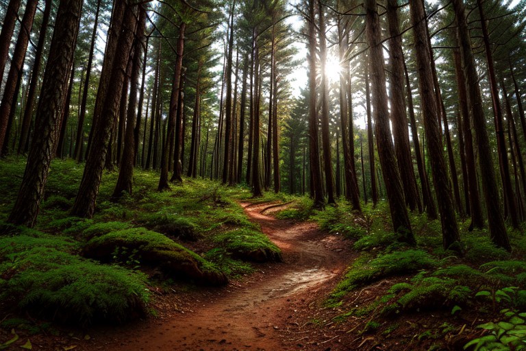 cinematic film still , RAW photo, realistic , perfect lighting, high quality, film grain, dense pines forest background, points of sun rays in the treetops, there is a steep, winding and large path with red mud and stones.