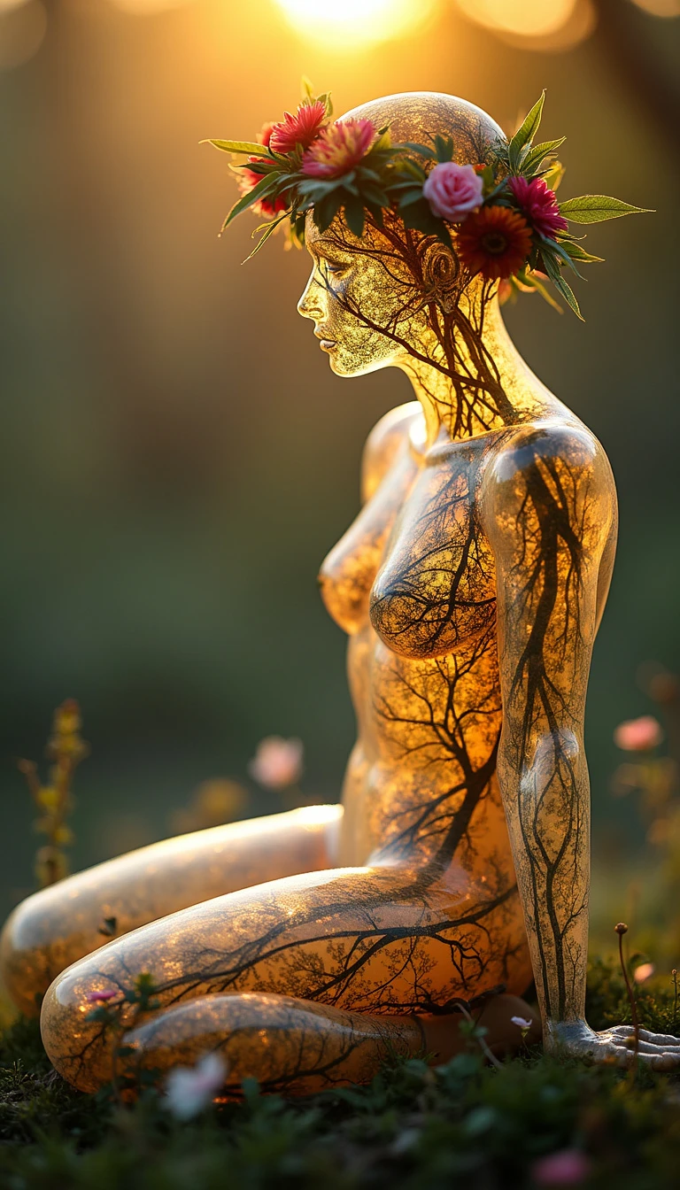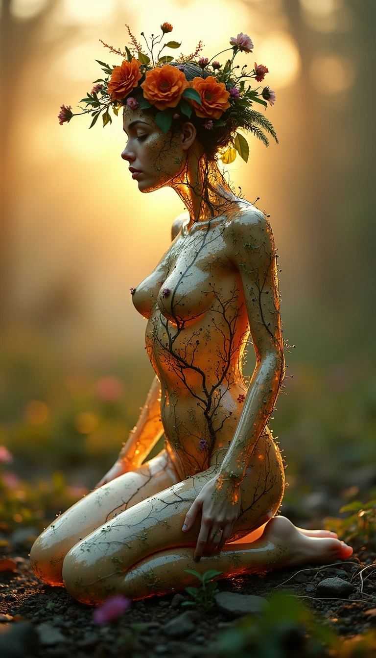 Scenario: A figure that combines human and natural elements, kneeling on the ground. Subject: The figure's body is translucent, revealing internal branches and leaves, indicating an integration with plant life. The head is adorned with a crown made of flowers and foliage. The background features a blurred sunset or sunrise, casting warm light through the figure's body and highlighting intricate details. Atmosphere: The warm light from the sunset or sunrise creates a soft, ethereal glow that enhances the connection between the human form and natural elements. Composition: The figure is centrally placed, kneeling with its translucent body and crown of flowers and foliage. The background's warm light filters through the figure, emphasizing its details. Style: Artistic and symbolic, blending human form with natural elements to convey a deep connection between humanity and nature. Lighting: Warm light from a sunset or sunrise creates a soft, glowing effect through the translucent body of the figure, accentuating the internal branches and leaves. Secondary_elements: The crown made of flowers and foliage, the translucent body with visible branches and leaves, and the warm, blurred background of the sunset or sunrise. Interaction: The figure's kneeling posture and integration with natural elements symbolize a profound connection between the human form and the natural world, enhanced by the warm, glowing light.