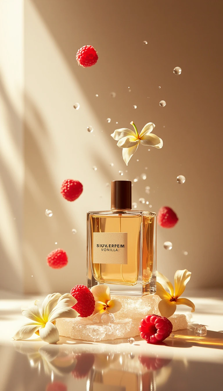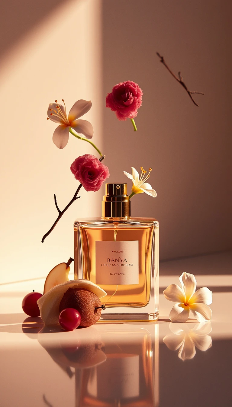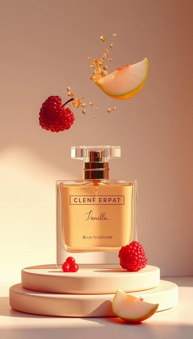 A stunning minimalist photograph of a luxurious and sensual fruity-floral perfume composition. The gracefully levitating ingredients include black currant, pear, raspberry, sandalwood, patchouli, vanilla. Set against a soft, illuminated background, the elegant elements emit a modern and sophisticated atmosphere, reminiscent of a high-end fashion advertisement. The absence of bottles showcases a clean, minimalist design that exudes refinement and allure, with a cinematic flair., product, cinematic, photo, fashion