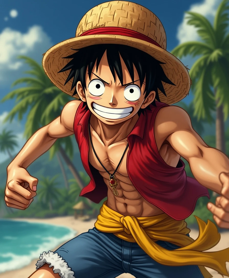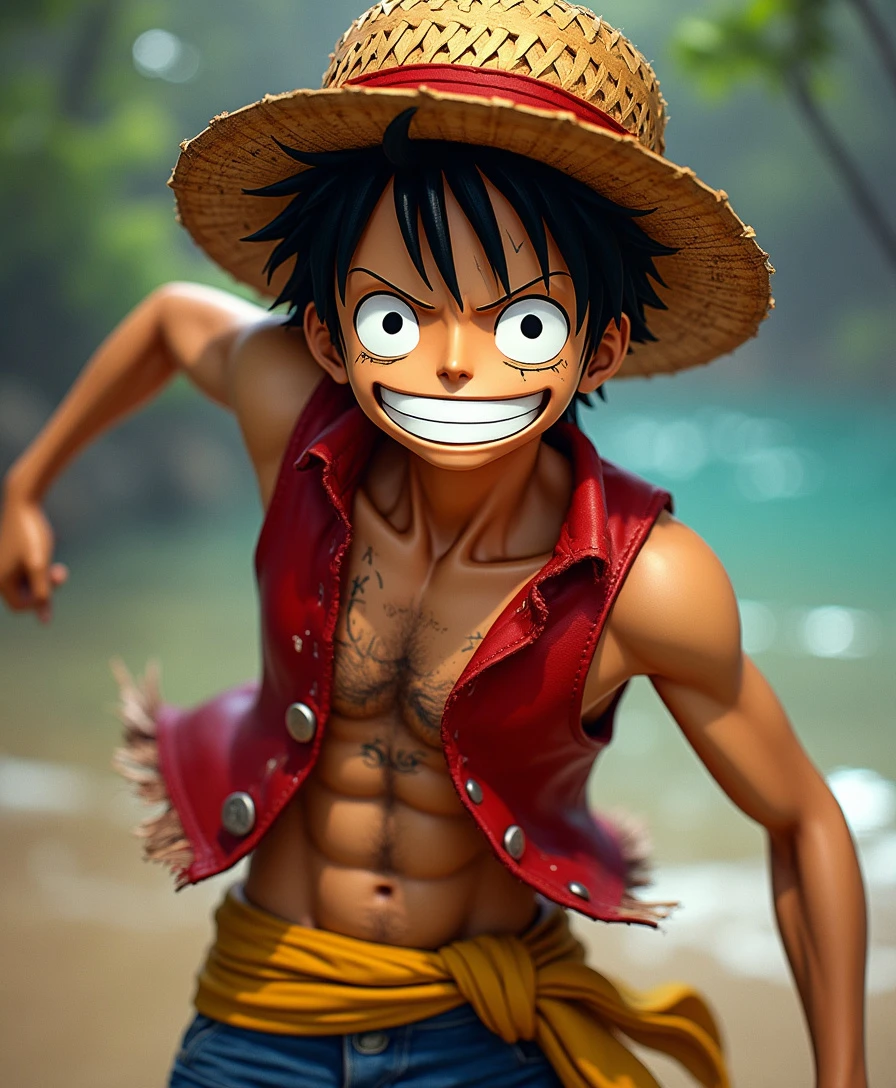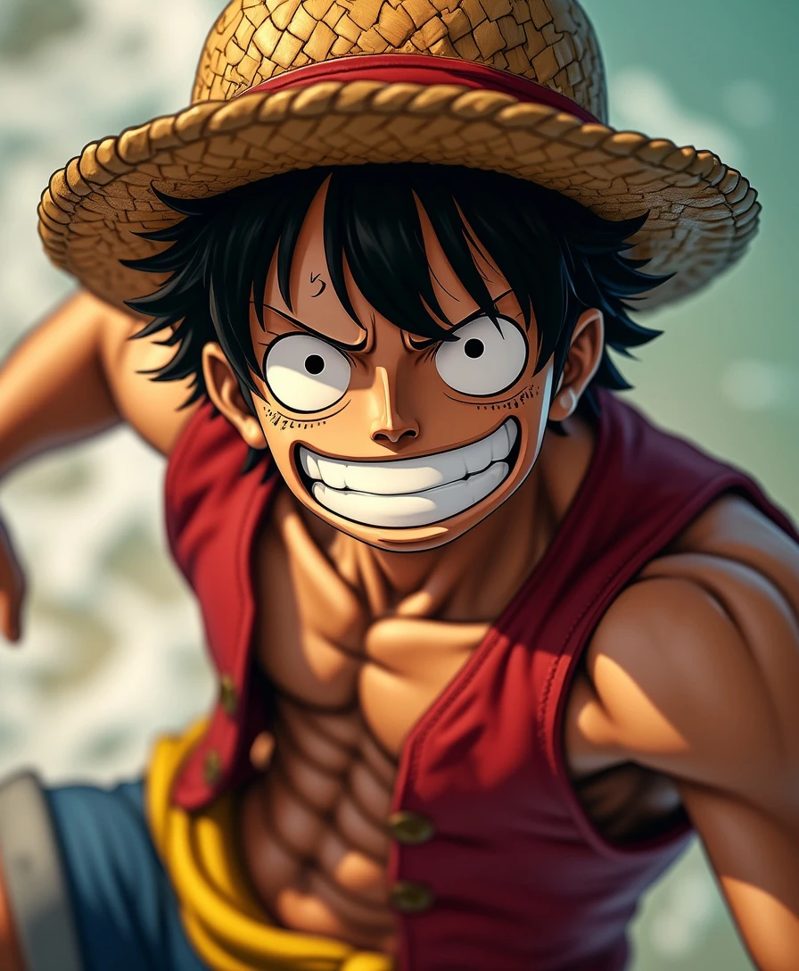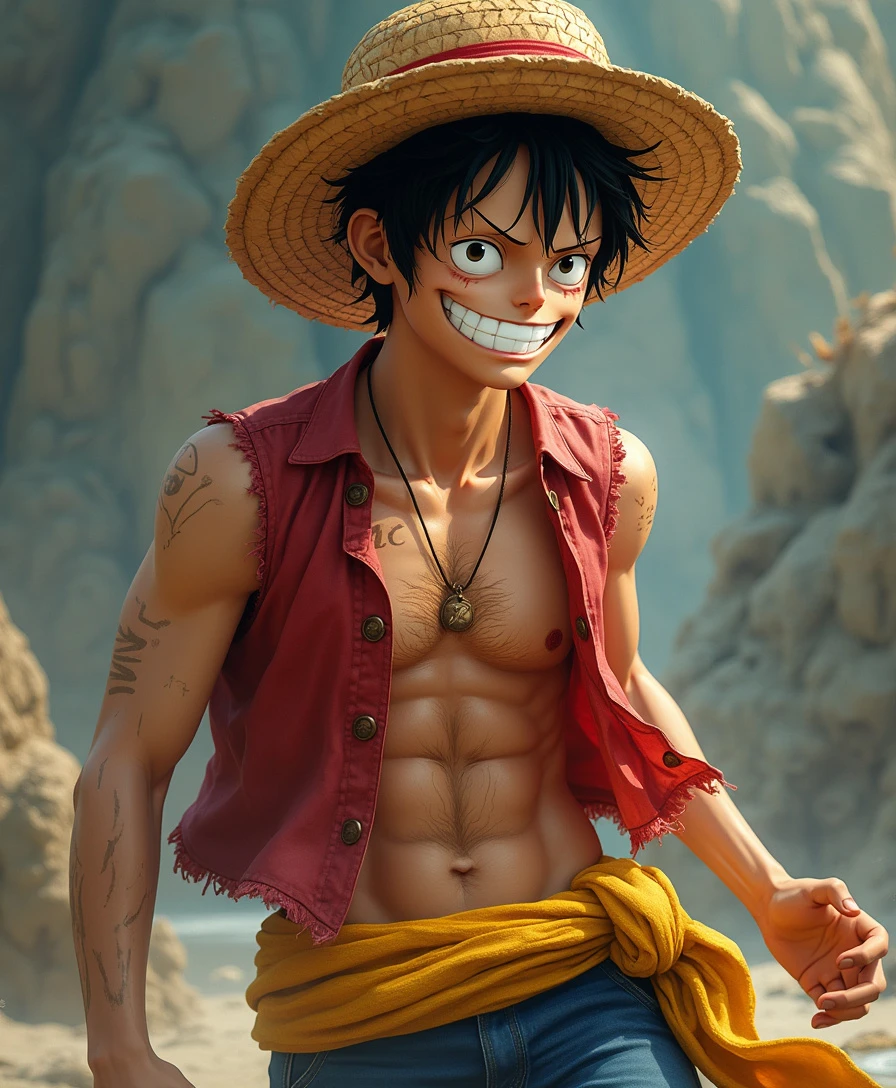Create an studio photograph of a normal human man dressed and somewhat resembling Monkey D. Luffy from "One Piece" Visual Details: Face: Luffy's face should be photo quality with a sailor rough texture, showing natural pores, subtle blemishes, and a slightly tanned complexion indicative of long days under the sun. His wide grin should be real, with iconic scar under his left eye rendered with precise, believable depth. The overall expression should reflect his adventurous spirit and unbreakable resolve. Eyes: His eyes should be brown, full of intensity and life, with realistic reflections of light. The pupils should be detailed, capturing a sense of depth and emotion, conveying both his determination and his playful nature. Hair: Luffy's black hair should be realistically tousled, with each strand individually detailed, reflecting a natural sheen as it catches the light. The hair should look slightly windblown, contributing to the overall realism of his outdoor, adventurous lifestyle. Hat: The straw hat must look worn and textured, with visible straw fibers and slight discoloration from exposure to the elements. The hat should cast a natural shadow on his face, adding depth and realism. Outfit: Clothing: Luffy’s red vest should be rendered in a way that showcases the texture of the fabric, with slight wear and tear from his numerous adventures. His muscular torso should be visible, with tanned skin tone and detailed scarring from past battles. His shorts made of heavy, durable fabric like denim, showing creases and natural wear. His sandals should also look well-worn, with details like fraying edges and scuffed soles. Accessories: The yellow sash tied around his waist should show folds and shadows, contributing to the overall appearance. Pose: Dynamic Pose: Capture Luffy in a powerful, mid-action pose, with one arm stretched out as if he’s about to perform a "Gomu Gomu no" attack. The muscles in his arm and body should be realistically detailed, showcasing tension and movement. His stance should convey readiness and strength, with every detail adding to the realism of the scene. Background: Setting: The background should depict a ocean scene, with the deep blue sea and the Thousand Sunny ship visible in the distance. The sky should be bright, with a few clouds, and the sunlight should reflect off the water, creating a stunning, realistic seascape. The waves should appear dynamic, with light catching on their crests, adding to the realism. Lighting: Natural lighting should be used to highlight the textures and details of Luffy's figure, with sunlight casting realistic shadows and creating depth. The overall atmosphere should evoke a sense of adventure and the vastness of the open sea. Artistic Style: photograph professional quality, studio lighting Color Palette: Use natural, yet vibrant colors that enhance the realism of the scene. The reds, blues, and yellows should be bold but believable, creating a vivid yet true-to-life image.