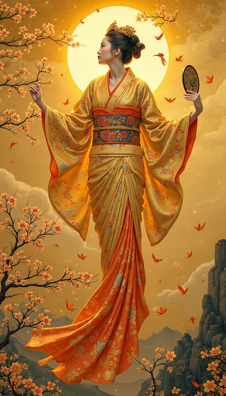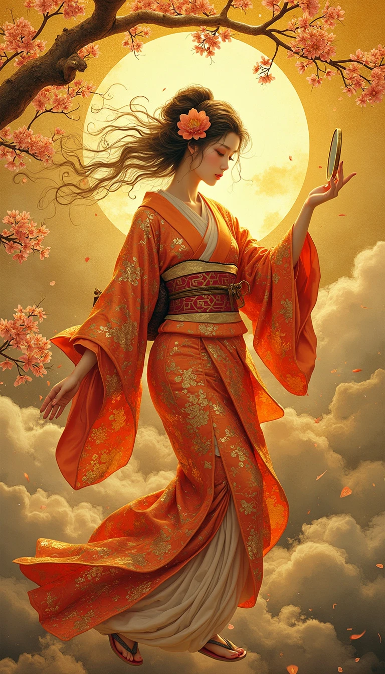 Amaterasu, Japanese Sun Goddess": Amaterasu floats in a golden sky, her kimono shimmering with sunlight. She holds a mirror that reflects blinding light. Cherry blossoms swirl around her. Style: Combination of Hokusai's Japanese aesthetics and Gustav Klimt's gold leaf techniques.