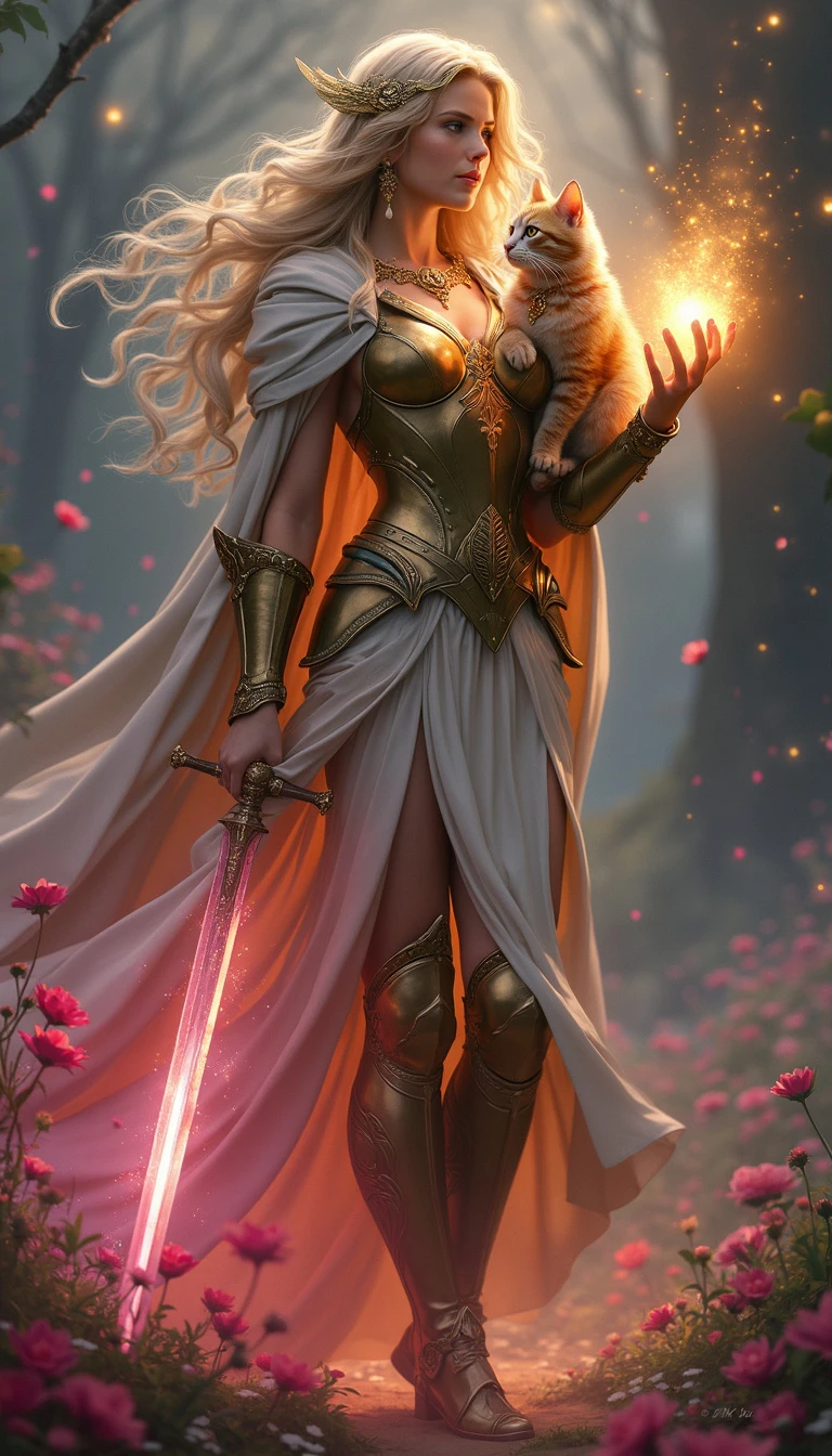 Freya, Goddess of Love and War: Full body portrait of Freya with a glowing loving cat. She wears a cloak of falcon feathers over gleaming golden armor. In one hand she holds Brisingamen, her magical necklace, emitting a warm, enticing light. The other hand wields a shimmering sword. The background shows both a lush, flowering meadow and a fierce battlefield. Art style inspired by Brom and Justin Sweet. Ultra-sharp focus on Freya, with magical particles swirling around her. Her aura shifts between soft pink and fierce red, symbolizing her dual nature. 8K, Unreal Engine 5 quality, blending Norse mythology with high fantasy aesthetics.