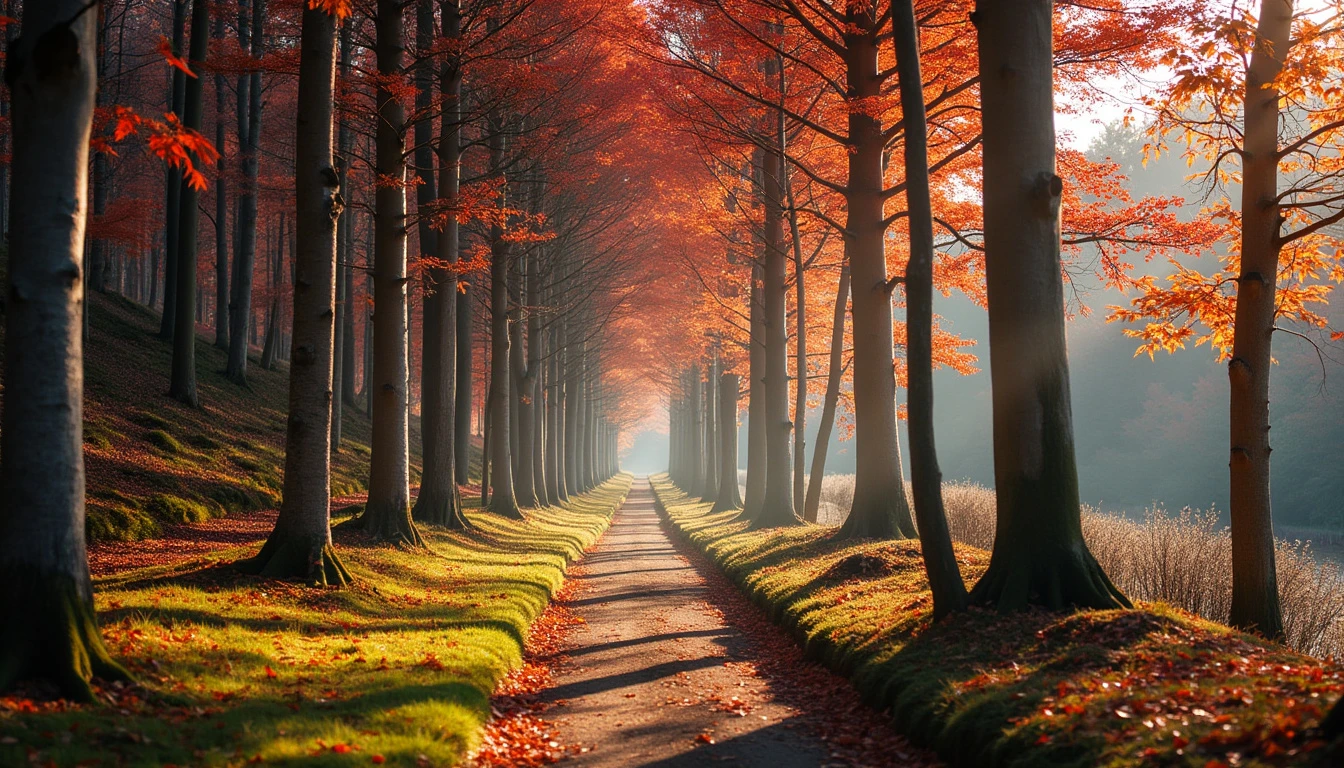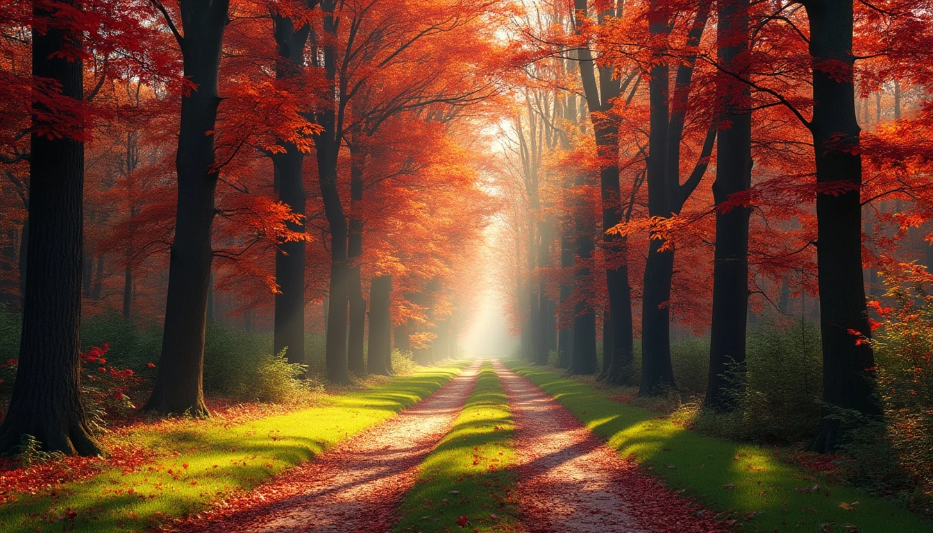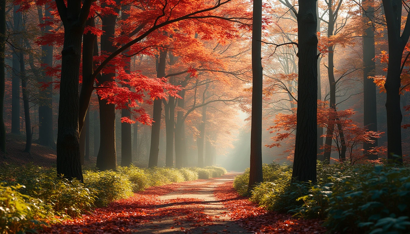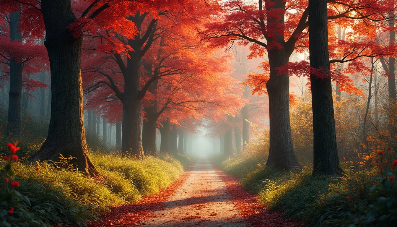 A serene forest in the midst of spring, tall trees with fiery red and orange foliage line a narrow, winding path. Sunlight filters through the trees, casting warm, dappled shadows on the path. The scene feels peaceful and inviting, perfect for a nature lover's wallpaper.