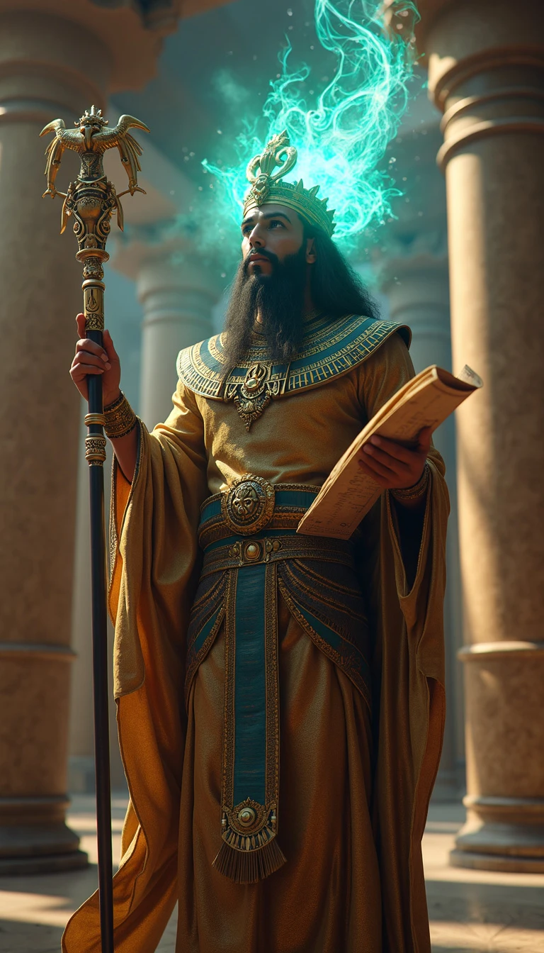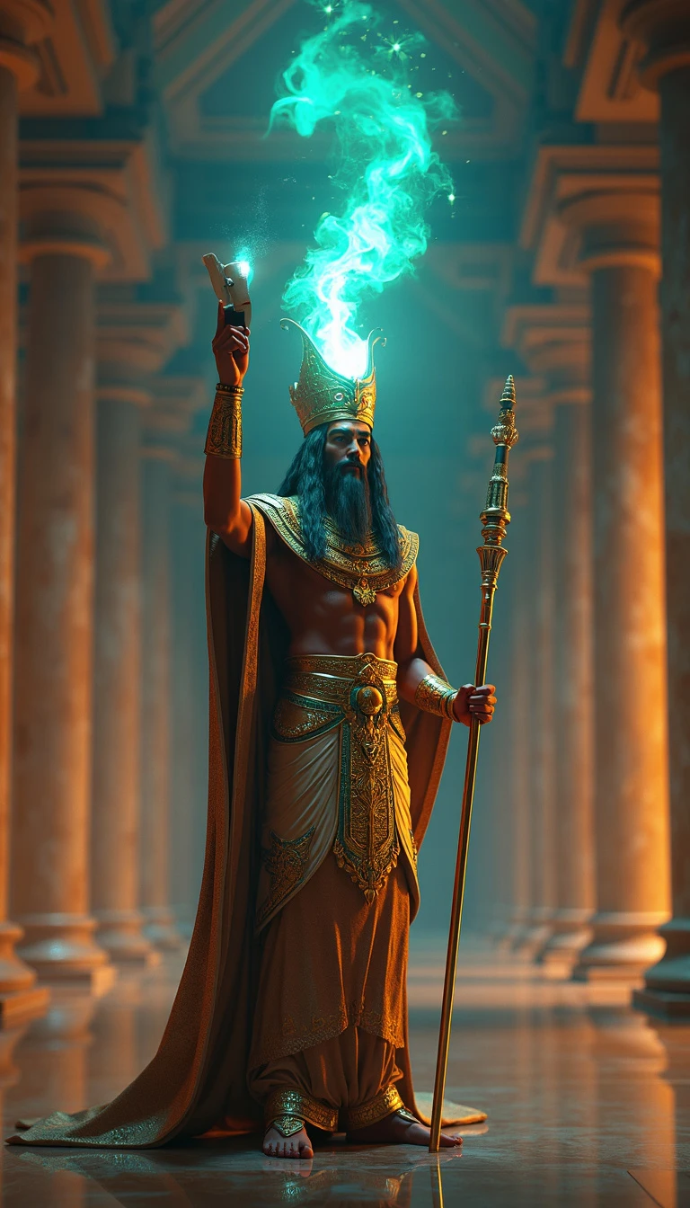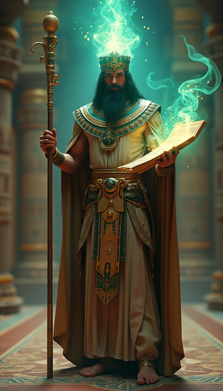 Full body picture of Thoth, God of Knowledge: Egyptian god Thoth, scholarly and mystical, holding a glowing papyrus scroll and magical staff, hyper-realistic digital art, great library of Alexandria backdrop, cinematic, art by Greg Rutkowski and Michael C. Hayes, ultra sharp focus, award-winning photograph, perfect contrast, high sharpness, depth of field, ultra detailed photography, global illumination, smooth, 8k, unreal engine 5, (large depth of field effect), emphasis on foreground elements, sharp focus, glorious, multicolor, iridescence, emitting a turquoise aura, energy, textures, magical presence, Volumetric light, realistic, 12k, multi-colored light, blending ancient Egyptian wisdom with cosmic knowledge."
