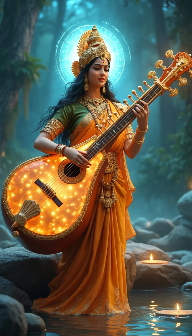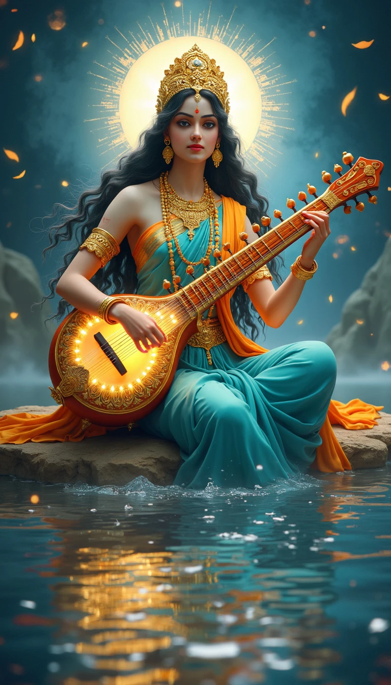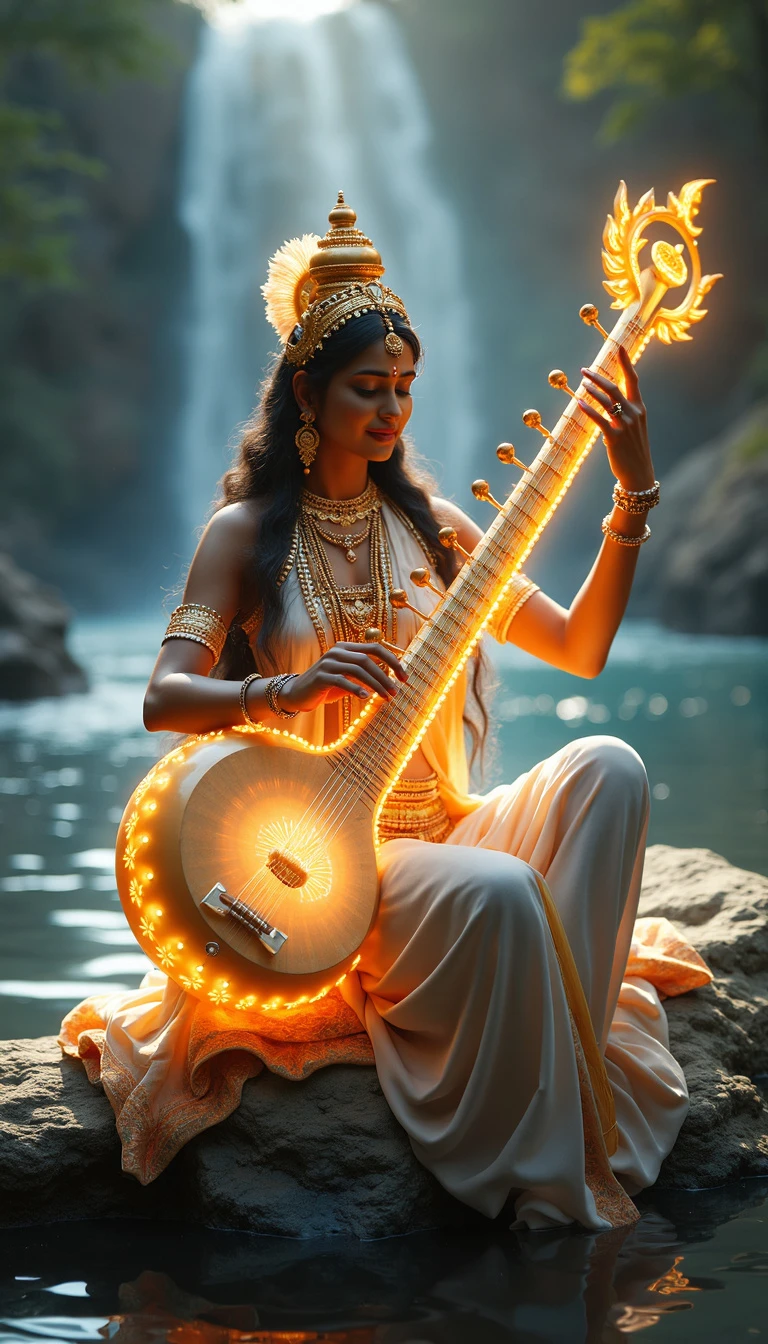 Full body picture of Saraswati, Goddess of Knowledge: Hindu goddess Saraswati, serene and enlightened, playing a glowing veena, hyper-realistic digital art, celestial river backdrop, cinematic, art by Ravi Varma and James Jean, ultra sharp focus, award-winning photograph, perfect contrast, high sharpness, depth of field, ultra detailed photography, global illumination, smooth, 8k, unreal engine 5, (large depth of field effect), emphasis on foreground elements, sharp focus, glorious, multicolor, iridescence, emitting a white aura, energy, textures, magical presence, Volumetric light, realistic, 12k, multi-colored light, blending Hindu iconography with divine inspiration