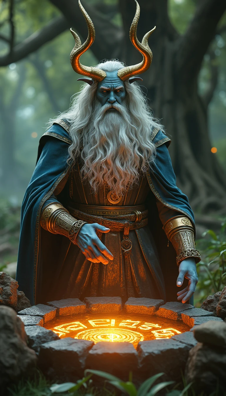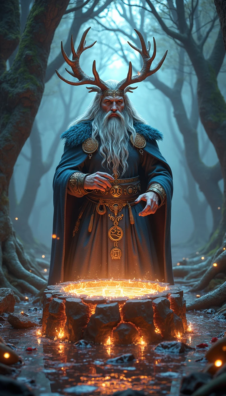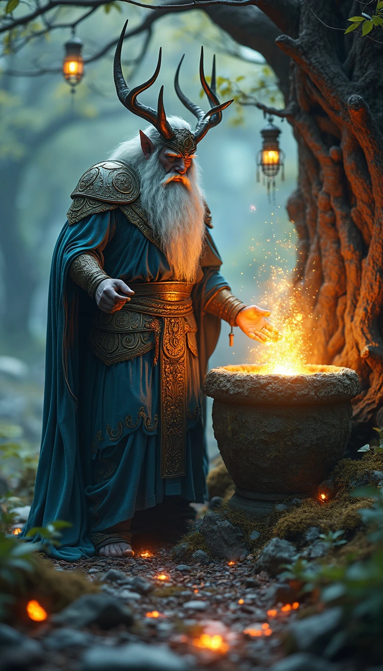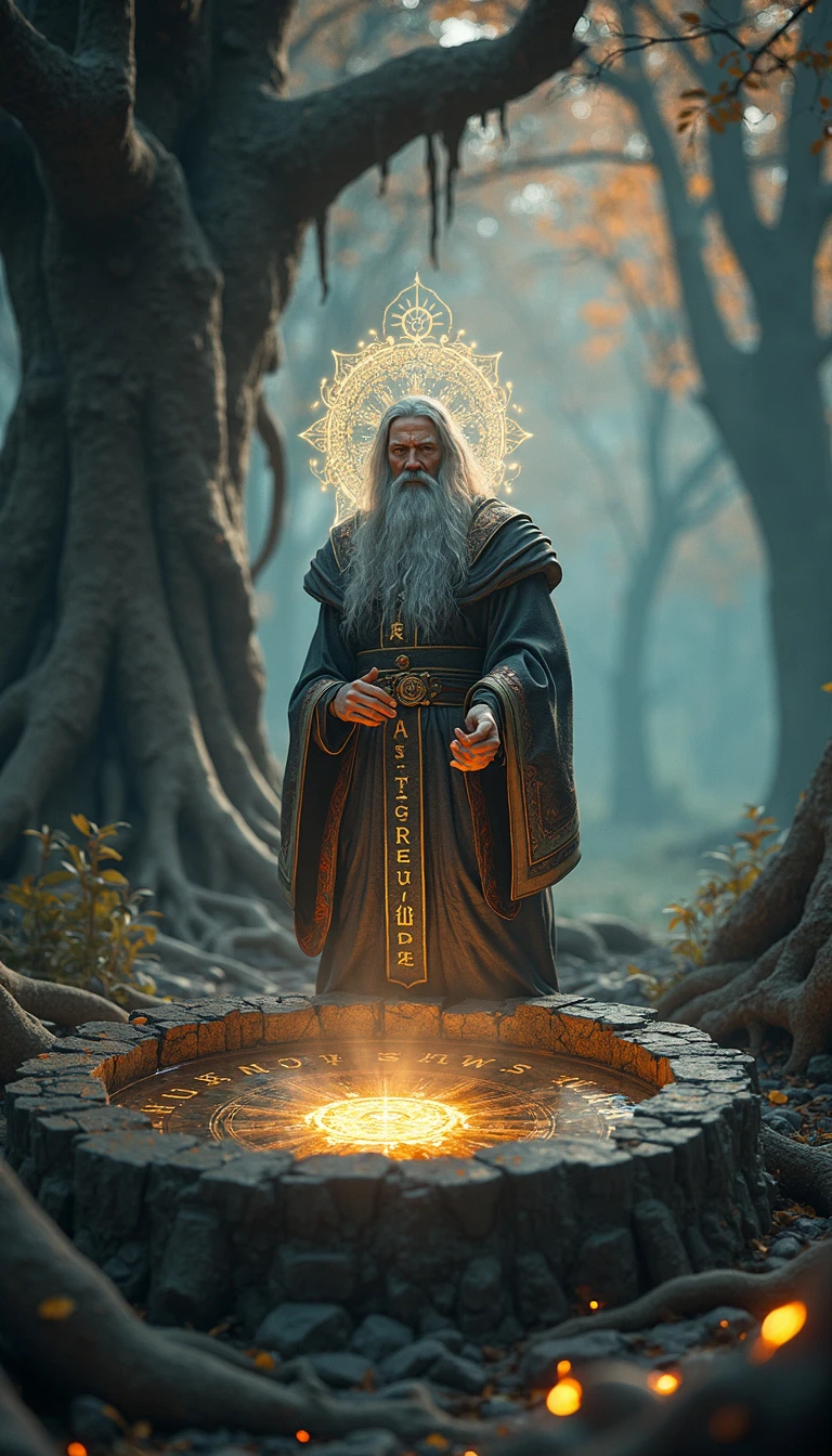 Full body picture of Mimir, God of Knowledge: Norse god Mimir, wise and otherworldly, standing beside his well of wisdom with glowing runes, hyper-realistic digital art, cosmic tree roots backdrop, cinematic, art by Peter Mohrbacher and Seb McKinnon, ultra sharp focus, award-winning photograph, perfect contrast, high sharpness, depth of field, ultra detailed photography, global illumination, smooth, 8k, unreal engine 5, (large depth of field effect), emphasis on foreground elements, sharp focus, glorious, multicolor, iridescence, emitting an ethereal aura, energy, textures, magical presence, Volumetric light, realistic, 12k, multi-colored light, blending Norse mythology with eldritch wisdom