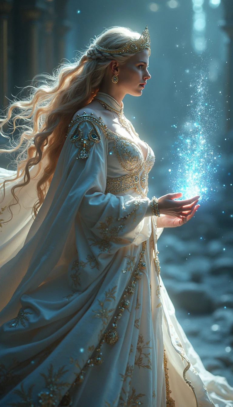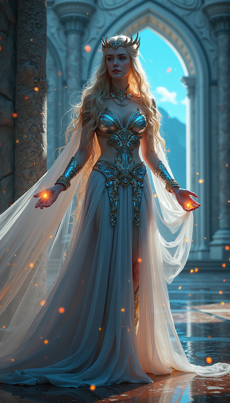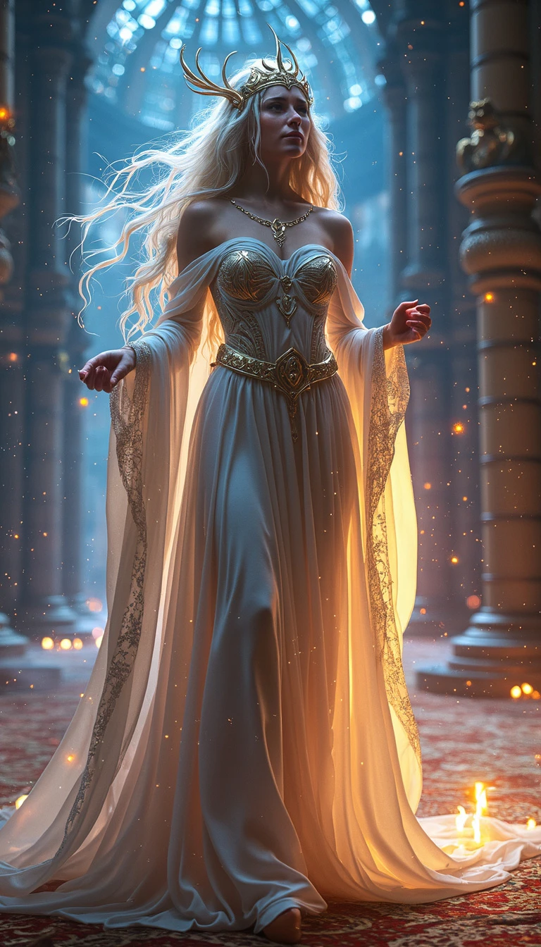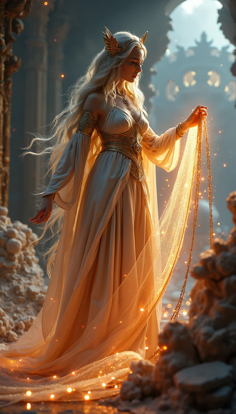Full body picture of Frigg, Goddess of Foresight: Norse goddess Frigg, regal and all-knowing, weaving fate on a glowing cosmic loom, hyper-realistic digital art, Asgard palace backdrop, cinematic, art by Brom and Artgerm, ultra sharp focus, award-winning photograph, perfect contrast, high sharpness, depth of field, ultra detailed photography, global illumination, smooth, 8k, unreal engine 5, (large depth of field effect), emphasis on foreground elements, sharp focus, glorious, multicolor, iridescence, emitting a silvery aura, energy, textures, magical presence, Volumetric light, realistic, 12k, multi-colored light, blending Norse mythology with cosmic destiny