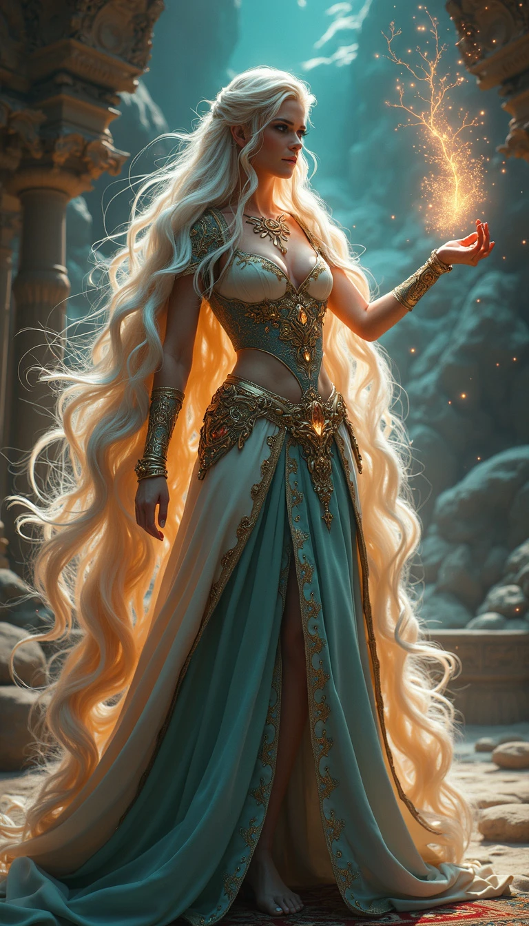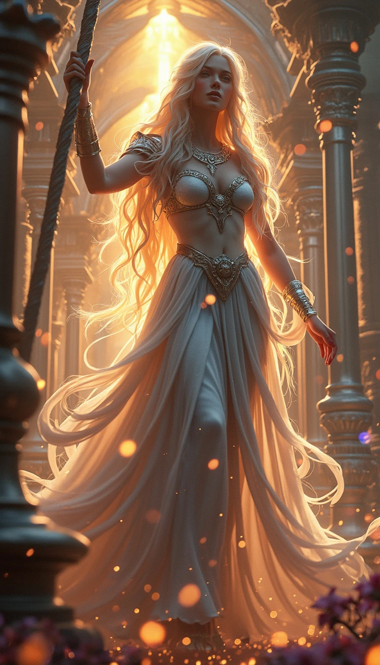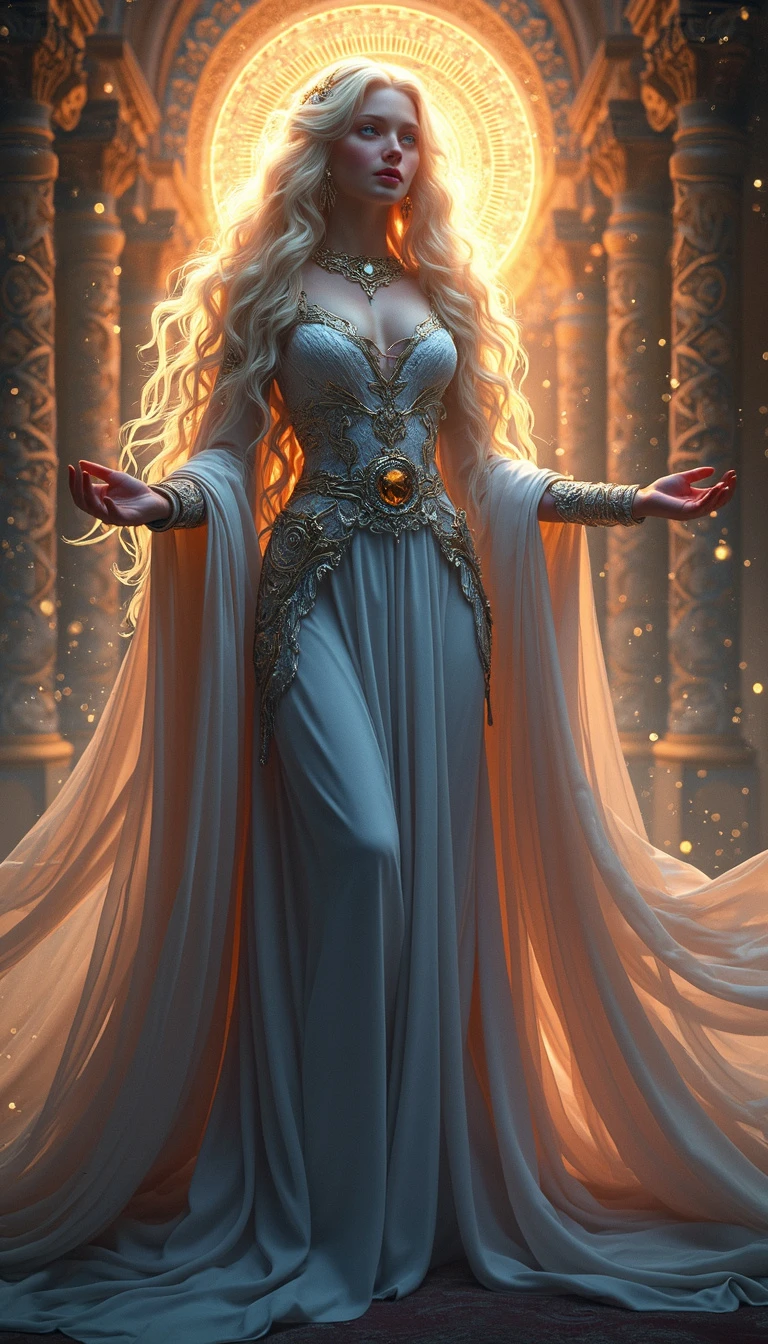 Full body picture of Frigg, Goddess of Foresight: Norse goddess Frigg, regal and all-knowing, weaving fate on a glowing cosmic loom, hyper-realistic digital art, Asgard palace backdrop, cinematic, art by Brom and Artgerm, ultra sharp focus, award-winning photograph, perfect contrast, high sharpness, depth of field, ultra detailed photography, global illumination, smooth, 8k, unreal engine 5, (large depth of field effect), emphasis on foreground elements, sharp focus, glorious, multicolor, iridescence, emitting a silvery aura, energy, textures, magical presence, Volumetric light, realistic, 12k, multi-colored light, blending Norse mythology with cosmic destiny