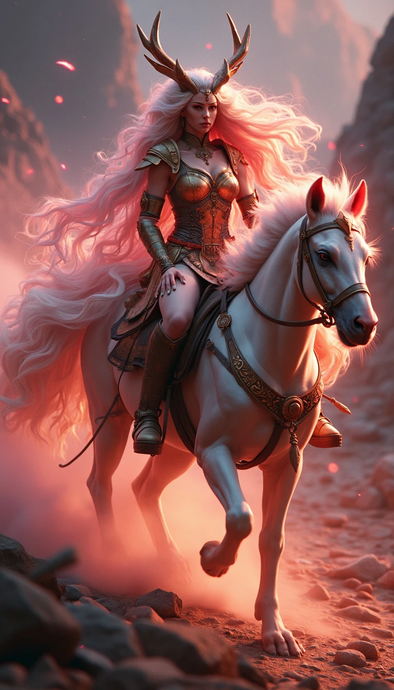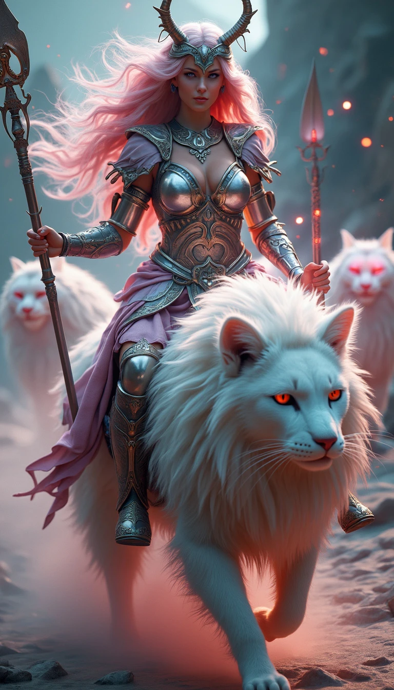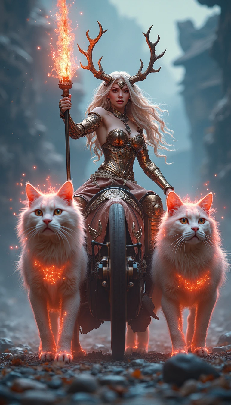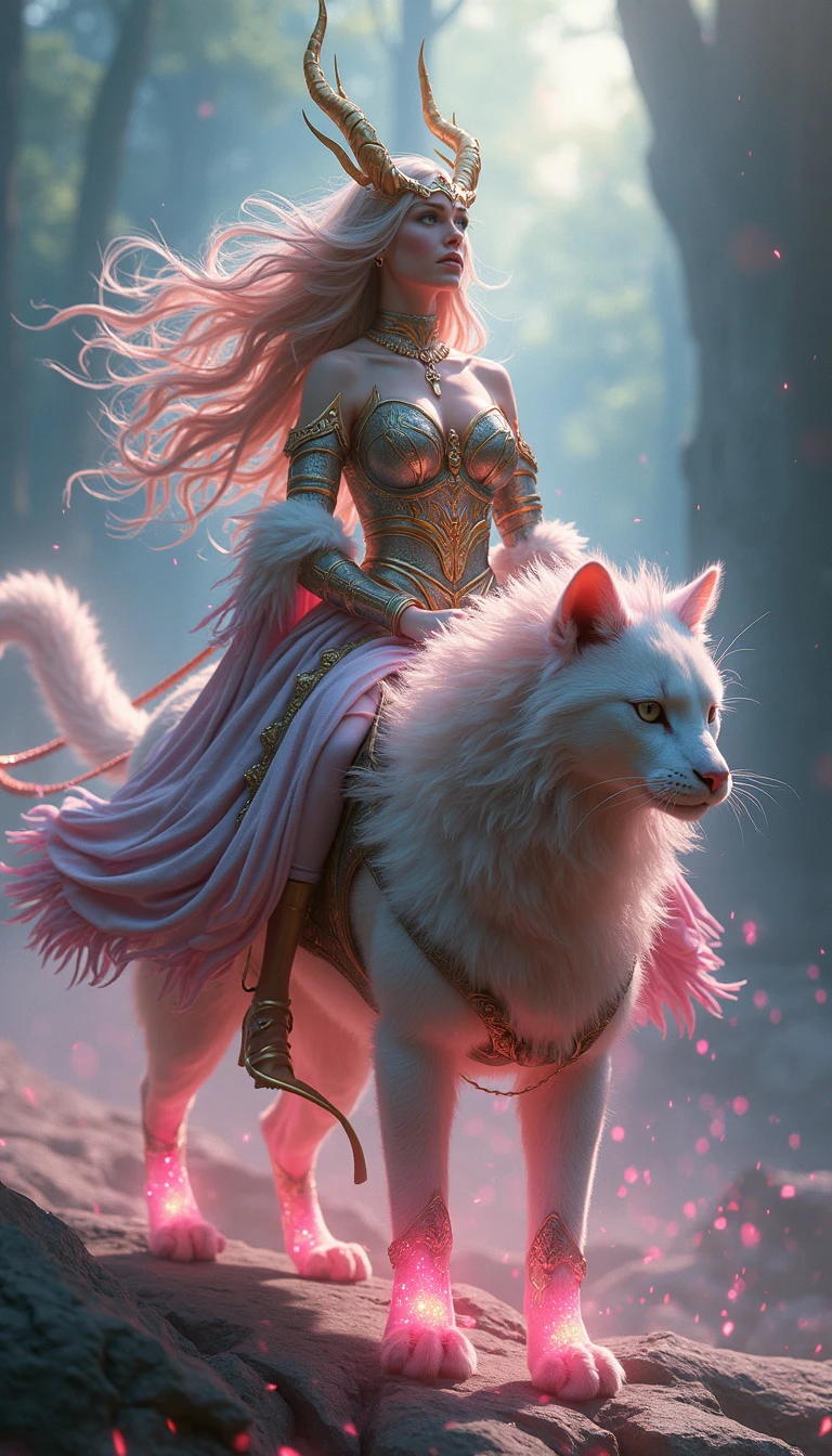 Full body picture of Freyja, Norse Goddess of War and Love: Freyja, beautiful and fierce, riding her chariot pulled by glowing magical cats, hyper-realistic digital art, Valhalla backdrop, cinematic, art by Julie Bell and Peter Mohrbacher, ultra sharp focus, award-winning photograph, perfect contrast, high sharpness, depth of field, ultra detailed photography, global illumination, smooth, 8k, unreal engine 5, (large depth of field effect), emphasis on foreground elements, sharp focus, glorious, multicolor, iridescence, emitting a shifting pink and red aura, energy, textures, magical presence, Volumetric light, realistic, 12k, multi-colored light, blending Norse mythology with concepts of beauty and battle