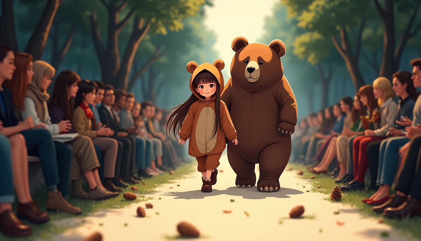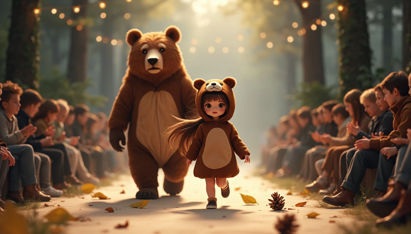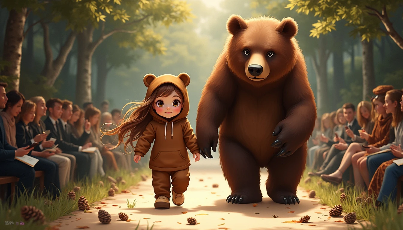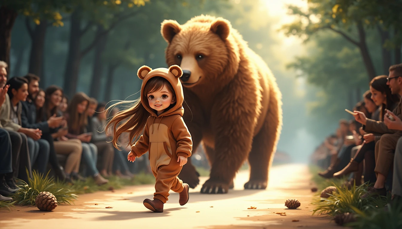 A hyper-detailed and photorealistic image of a young girl, around four years old, with long brown hair flowing down her back, dressed in an adorable bear costume, walking down a fashion runway during a high-end fashion show. The costume is made of soft, brown fabric that mimics the fur of a real bear, complete with a hood featuring round ears and a cute, gentle expression. Walking just behind the girl is a real, life-like adult bear, towering over her as they move down the runway together. The runway is subtly decorated with a few scattered pinecones and forest leaves that hint at a woodland atmosphere, while still allowing the audience seated around the runway to be clearly visible. The scene is captured from a mid-distance, showing the girl confidently leading the way with her long brown hair gently swaying as the bear follows closely behind, adding a sense of natural strength and slightly wild ambiance to the fashion show, with the audience captivated by the majestic duo.