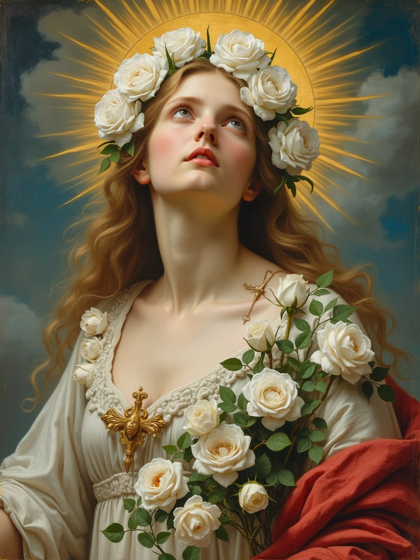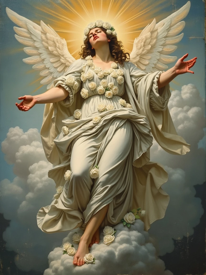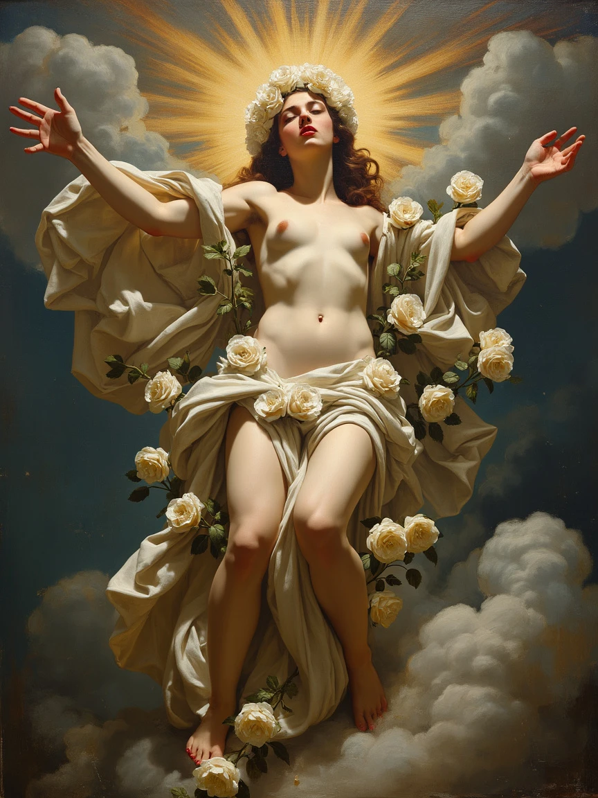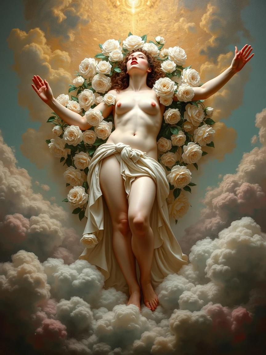 An old renaissance oil painting of a female deity covered with white roses as the ascends to the heavens.