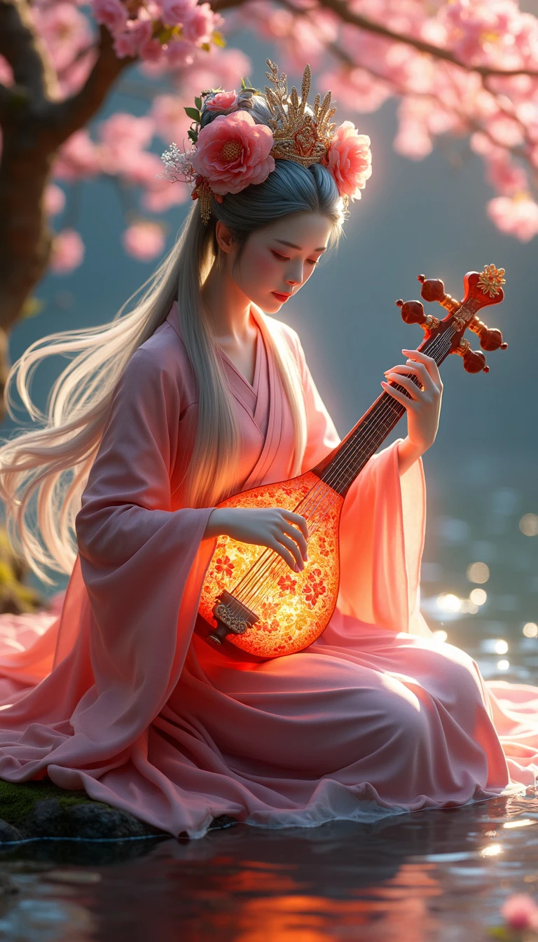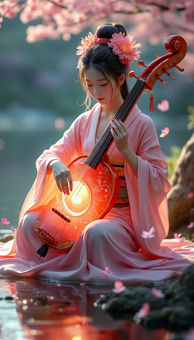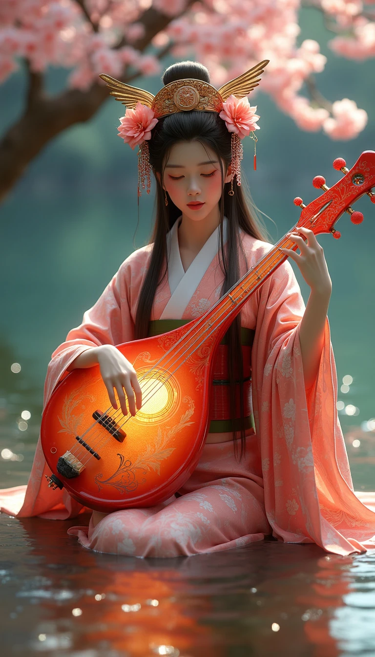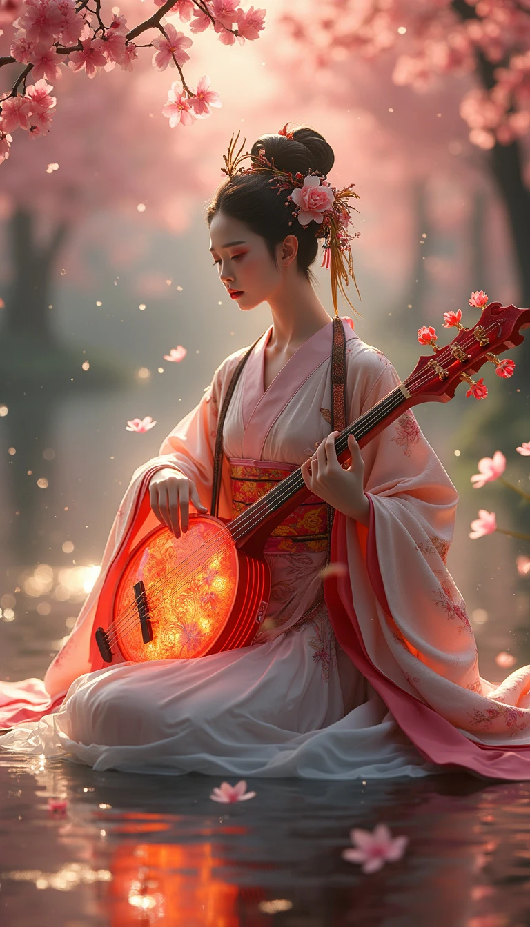 Full body picture of Benzaiten, Japanese Goddess of Love and Beauty: Benzaiten, ethereal and musical, playing a glowing biwa, hyper-realistic digital art, cherry blossom lake backdrop, cinematic, art by Yoshitaka Amano and James Jean, ultra sharp focus, award-winning photograph, perfect contrast, high sharpness, depth of field, ultra detailed photography, global illumination, smooth, 8k, unreal engine 5, (large depth of field effect), emphasis on foreground elements, sharp focus, glorious, multicolor, iridescence, emitting a pearlescent aura, energy, textures, magical presence, Volumetric light, realistic, 12k, multi-colored light, blending Japanese mythology with artistic beauty."
