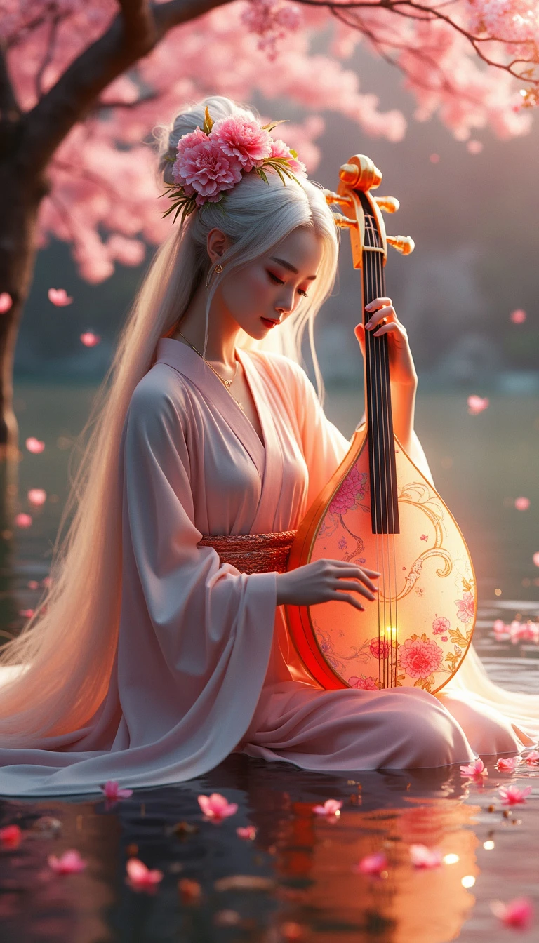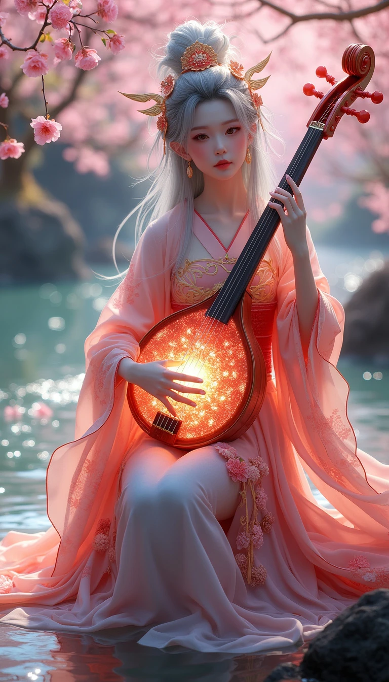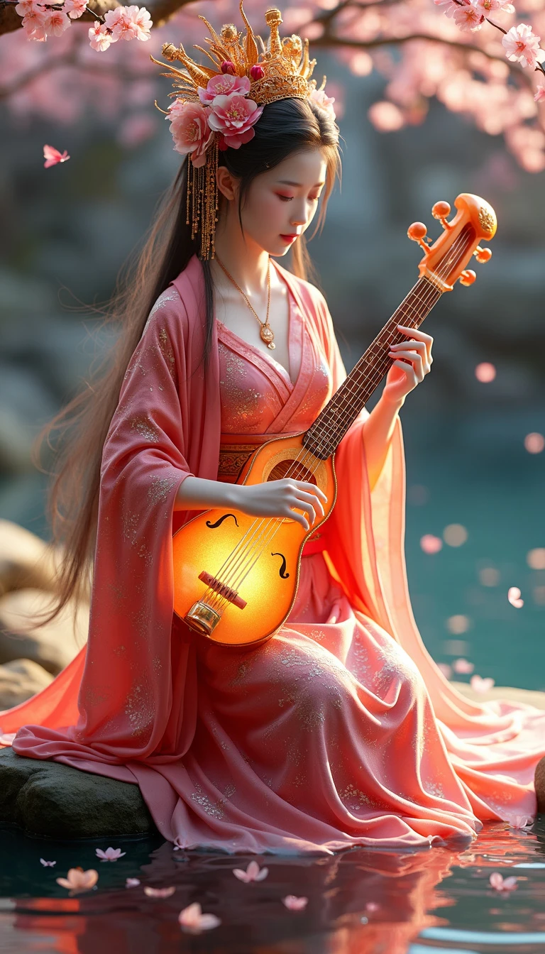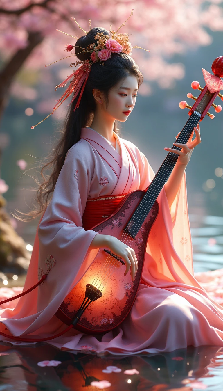 Full body picture of Benzaiten, Japanese Goddess of Love and Beauty: Benzaiten, ethereal and musical, playing a glowing biwa, hyper-realistic digital art, cherry blossom lake backdrop, cinematic, art by Yoshitaka Amano and James Jean, ultra sharp focus, award-winning photograph, perfect contrast, high sharpness, depth of field, ultra detailed photography, global illumination, smooth, 8k, unreal engine 5, (large depth of field effect), emphasis on foreground elements, sharp focus, glorious, multicolor, iridescence, emitting a pearlescent aura, energy, textures, magical presence, Volumetric light, realistic, 12k, multi-colored light, blending Japanese mythology with artistic beauty."