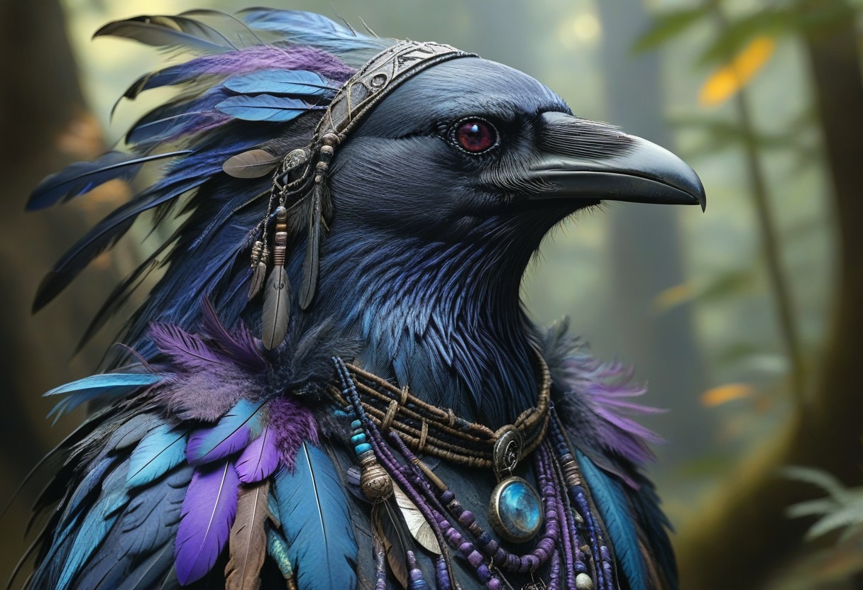 corvidfolk, mystical shaman, blue and purple feathers