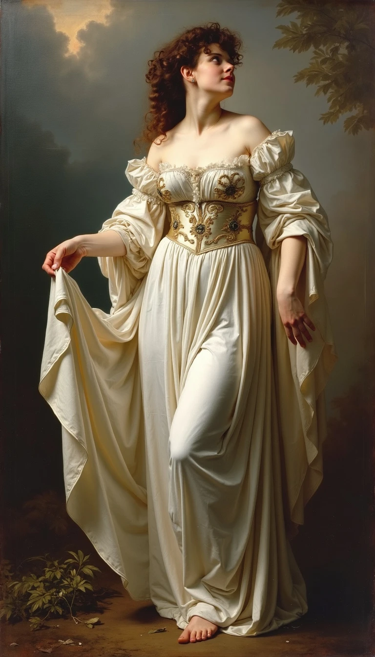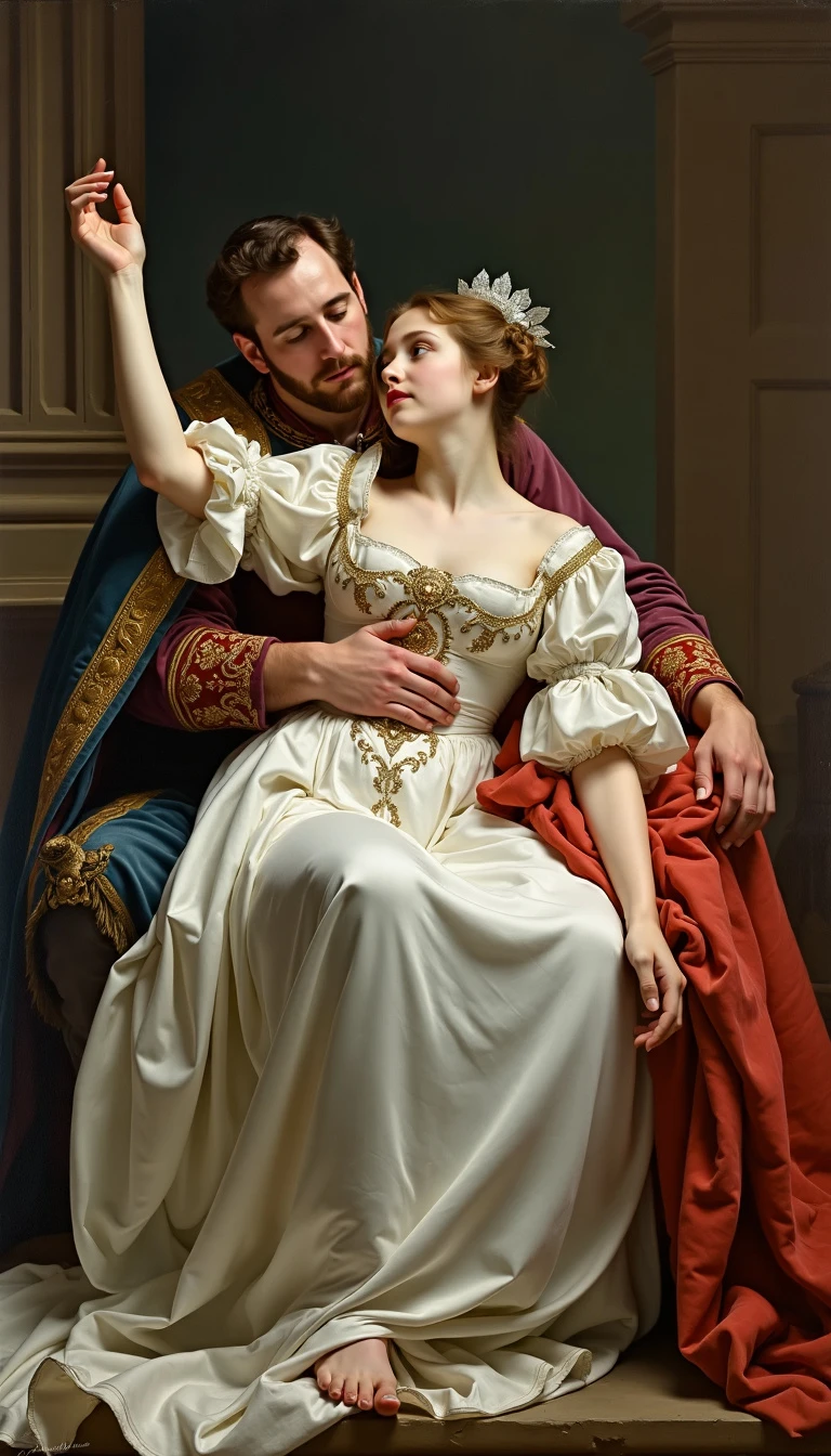 A work by Thomas Benjamin Kennington in the style of the artist, queen in king's arms , dressed up by a heaven dress