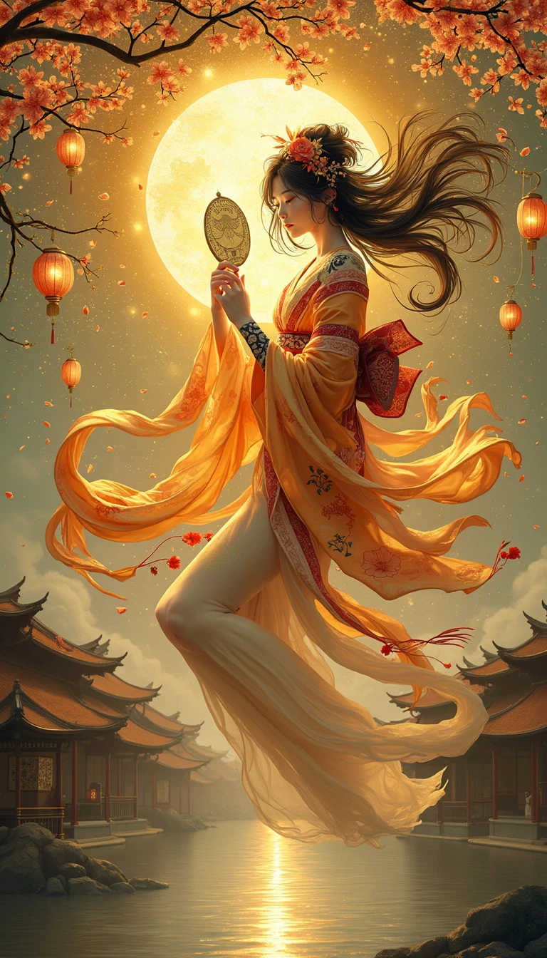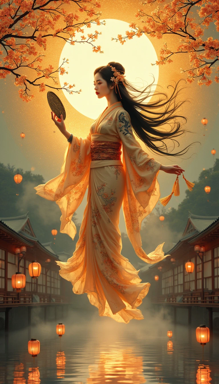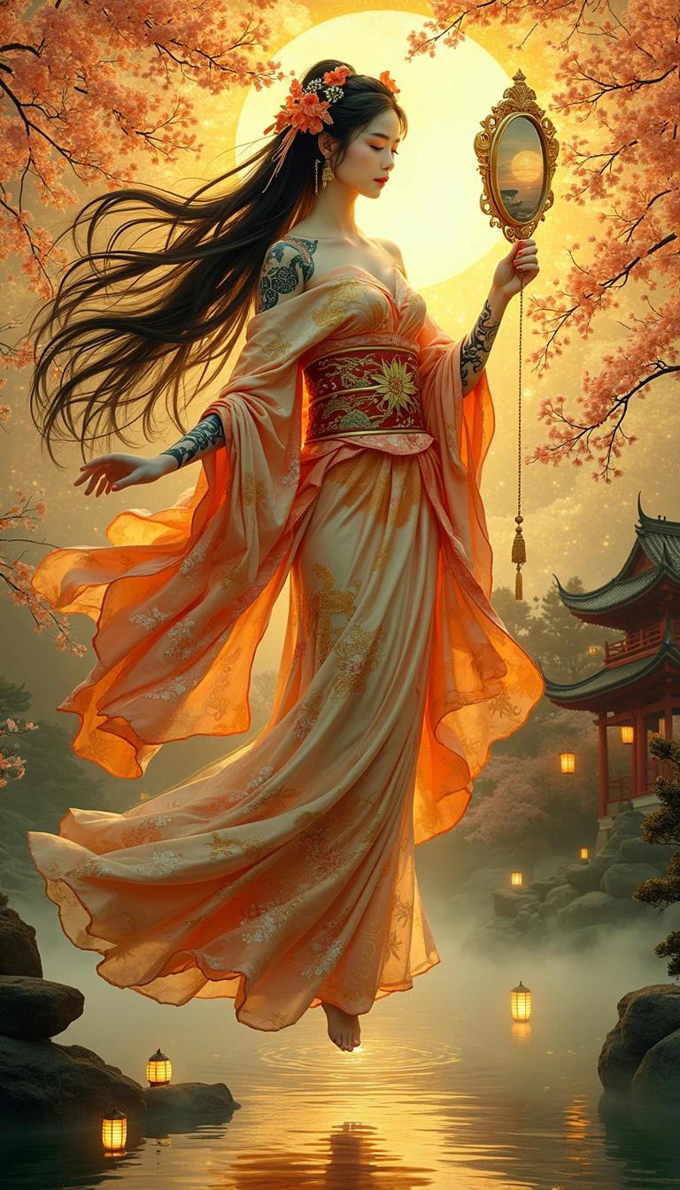 Amaterasu, the radiant Japanese Sun Goddess, floats majestically in a golden sky, her kimono shimmering with sunlight, woven with patterns inspired by Gustav Klimt's gold leaf technique. She holds the sacred mirror Yata no Kagami, which reflects a blinding, divine light. Cherry blossoms swirl around her, their petals glowing softly in the warm radiance. Her serene face, framed by flowing black hair, exudes calm wisdom, with a hint of melancholy that reflects her celestial burden. Her headdress, adorned with cherry blossoms and tassels, enhances her divine presence. The gossamer fabric of her kimono catches the light, revealing elegant black ink tattoos of florals and traditional Japanese designs on her arms and shoulders. Below her, a tranquil pond mirrors her golden light, mist hovering above the water. Traditional lanterns float around the scene, casting a mystical glow. The background features the curved rooftops of Japanese architecture, grounding the celestial scene in the beauty of ancient Japan. The scene blends Hokusai’s Japanese aesthetics with Klimt’s luxurious style, capturing Amaterasu’s serene yet powerful presence as the embodiment of light and life.