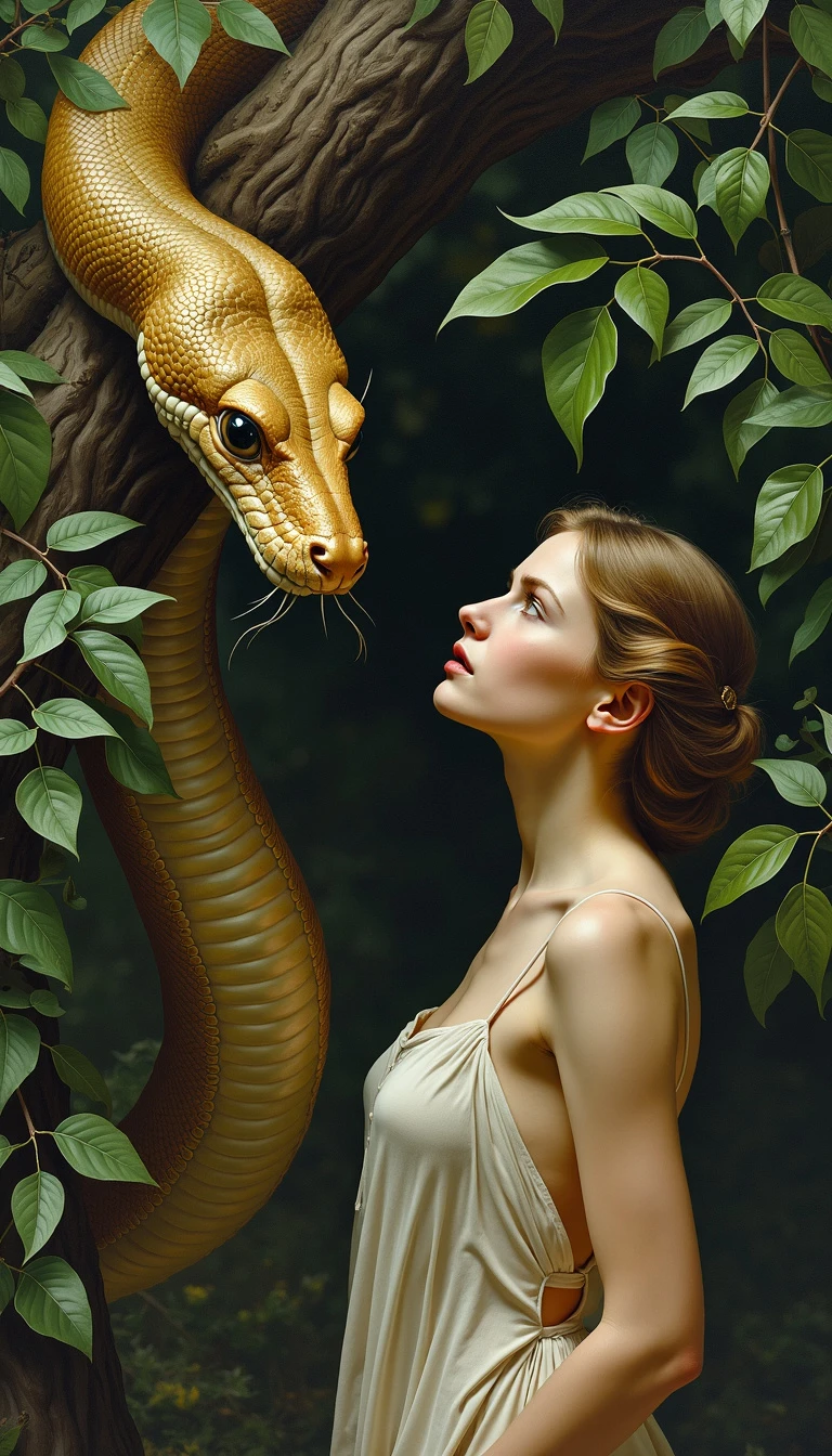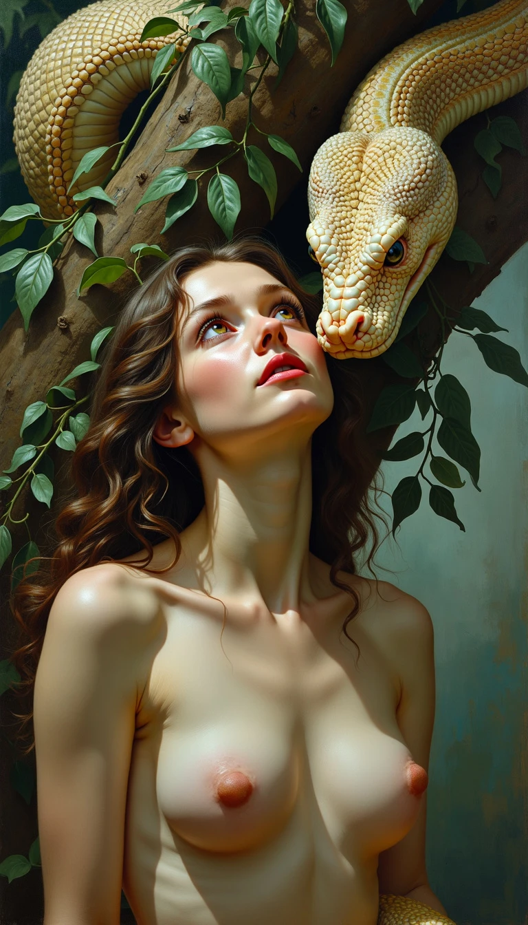The painting reimagines the Biblical scene of Eve’s temptation, featuring her standing gracefully beneath the Tree of Knowledge. her body covered by leaves, Eve is depicted in a medium full shot at eye level, her body facing the giant python that coils its massive form around the trunk of the tree. Her expression is a blend of curiosity and hesitation as she engages with the serpent's gaze. Eve’s face is rendered with classical beauty, showcasing hazel eyes that reflect a mix of allure and uncertainty. Her full lips and delicate straight nose enhance her timeless elegance. The python’s iridescent scales and coiled body create a dramatic and menacing backdrop, intensifying the scene's tension and allure.