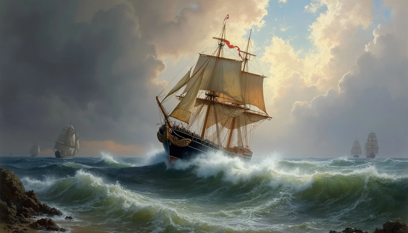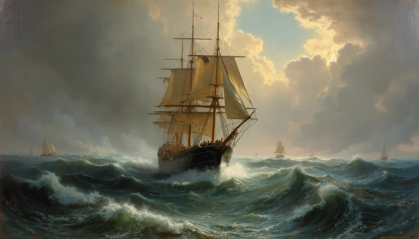 A work by Thomas Benjamin Kennington , Inspired by J.M.W. Turner's seascapes with William-Adolphe Bouguereau's figurative realism.A real ship in the middle of the water, involved in heavy waves