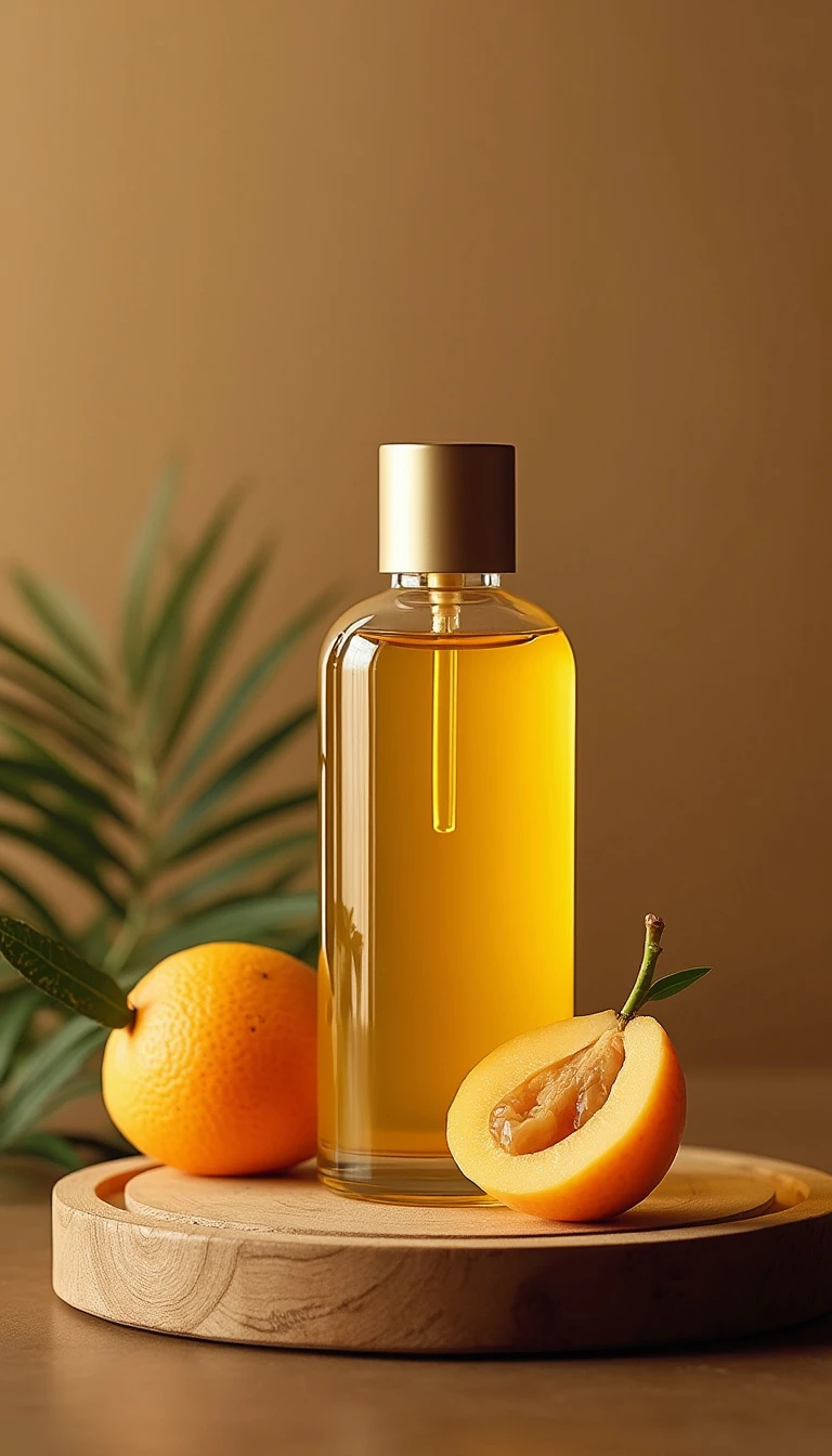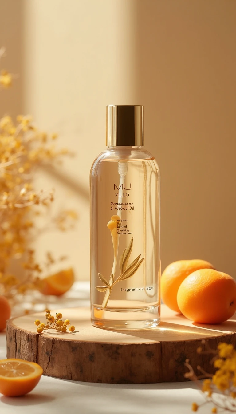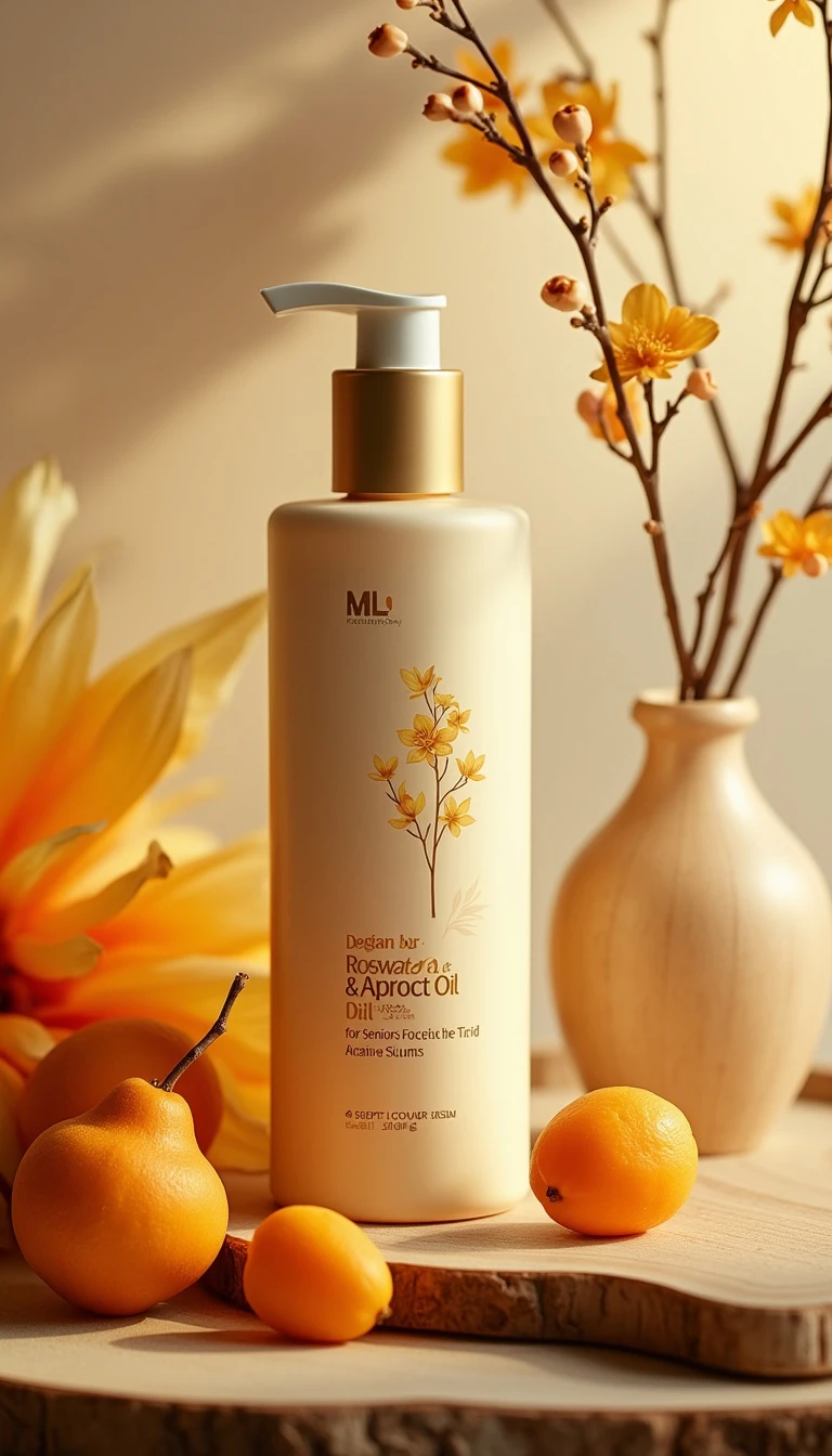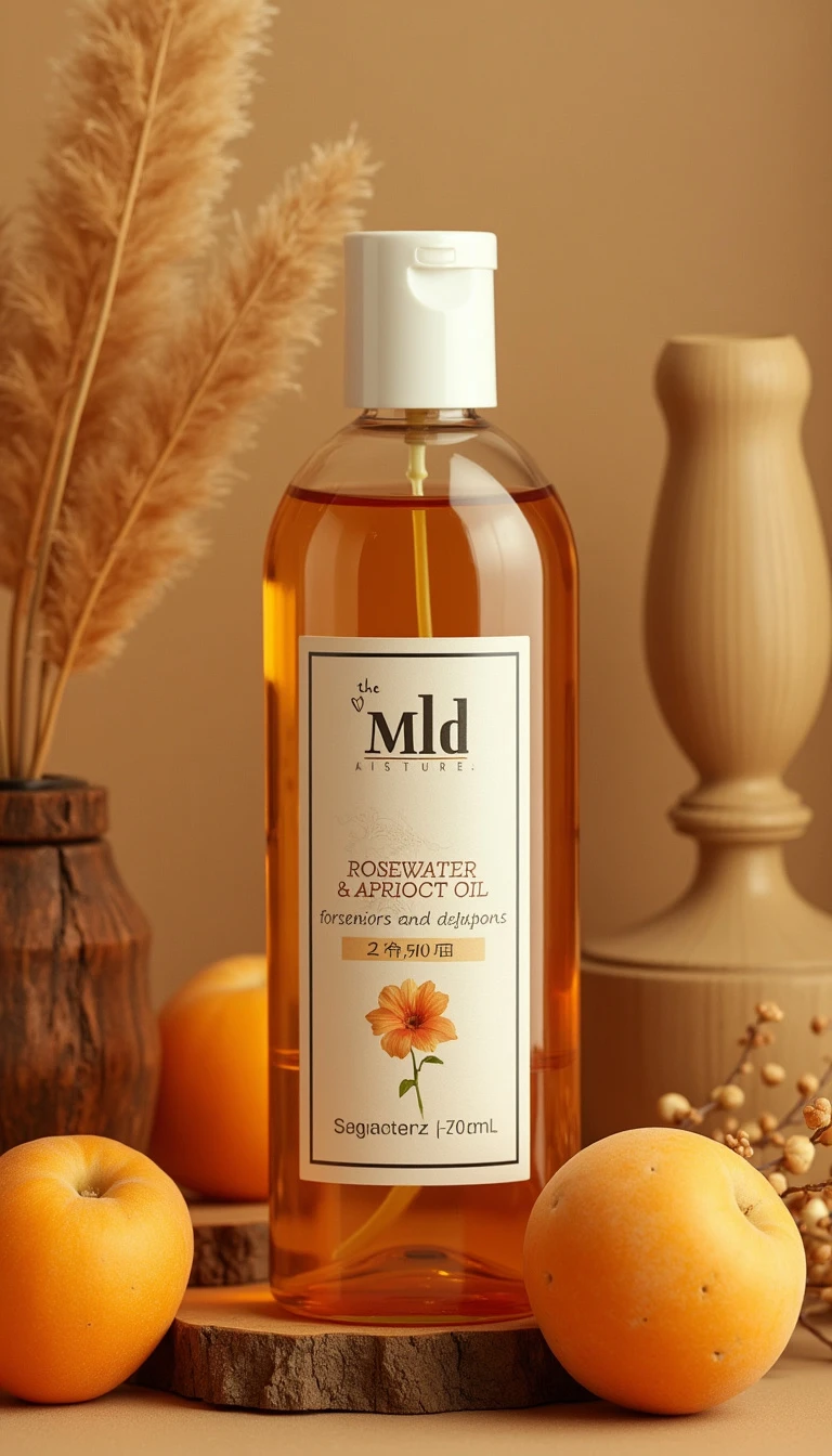 commercial photography, the mld rosewater & apricot oil for seniors and asian women, in the style of still life focus, dark beige and yellow, sandara tang, streamlined design, flat form, metropolis meets nature, wood