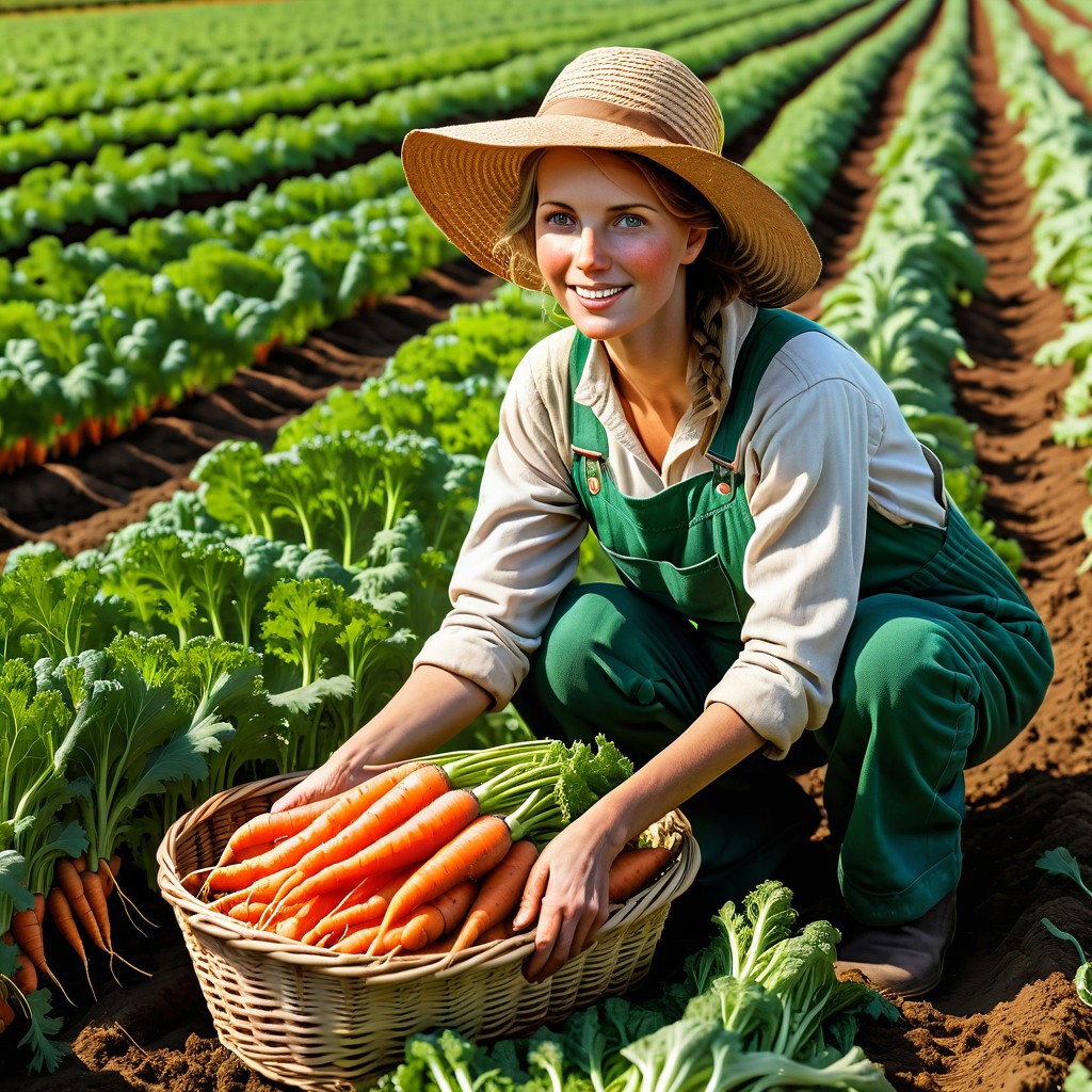A beautiful farm woman picking carrots by hand in a large carrot field, next to her is a half full woven basket of carrots. The woman is wearing coveralls and a wide brimmed hat.