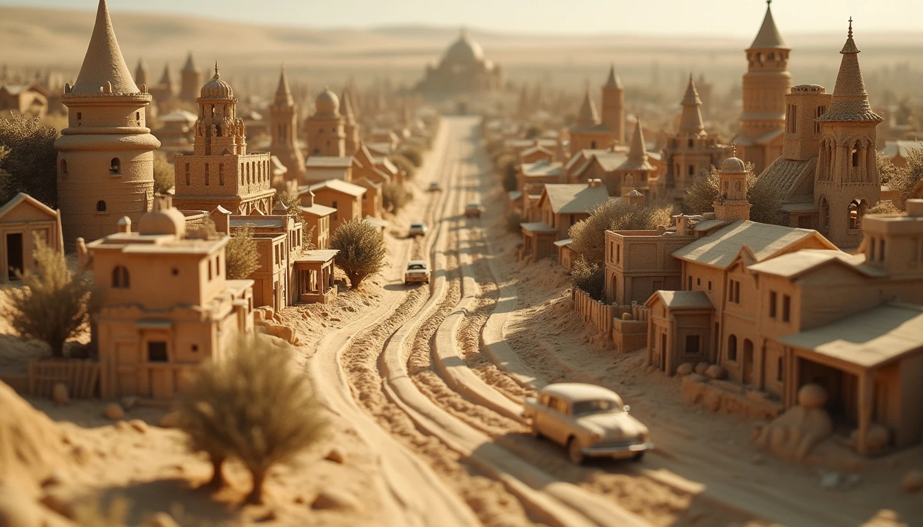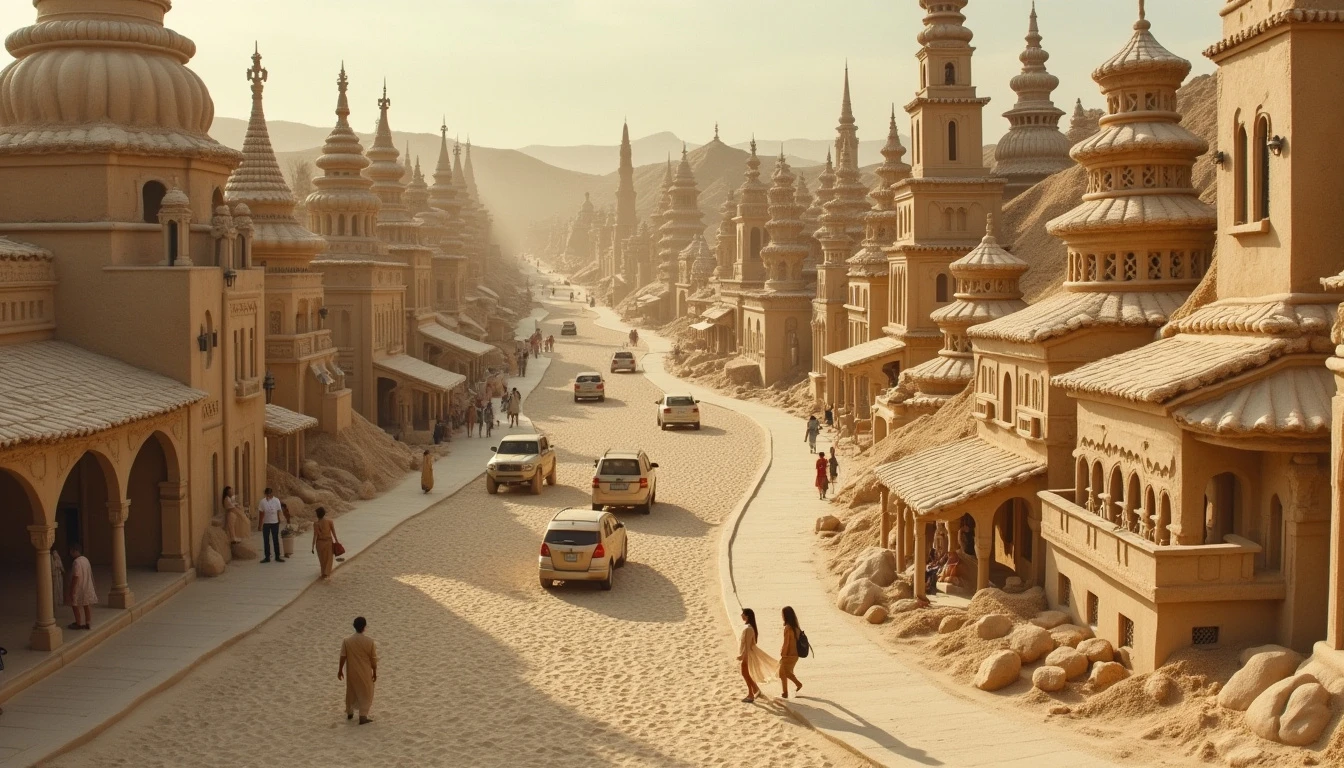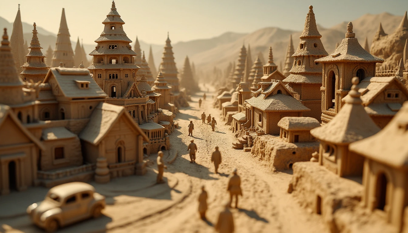 Envision a world where everything is crafted from sand, as if the grains have come to life to form a modern metropolis. Capture this surreal scene with a medium-format camera, using a 50mm lens to emphasize the intricate textures and details of the sand structures. The aperture is set to f/11 to ensure a deep depth of field, keeping the sand buildings, people, cars, and houses in sharp focus from front to back. The shutter speed is set to 1/125s to freeze the gentle movement of the sand particles in the breeze, creating a sense of stillness in this ephemeral world. The lighting is soft and diffused, with a warm color temperature to evoke a sense of wonder and magic. The camera is positioned at a slight Dutch angle, adding a touch of dynamism to the composition, as if the viewer is discovering this fantastical world for the first time.