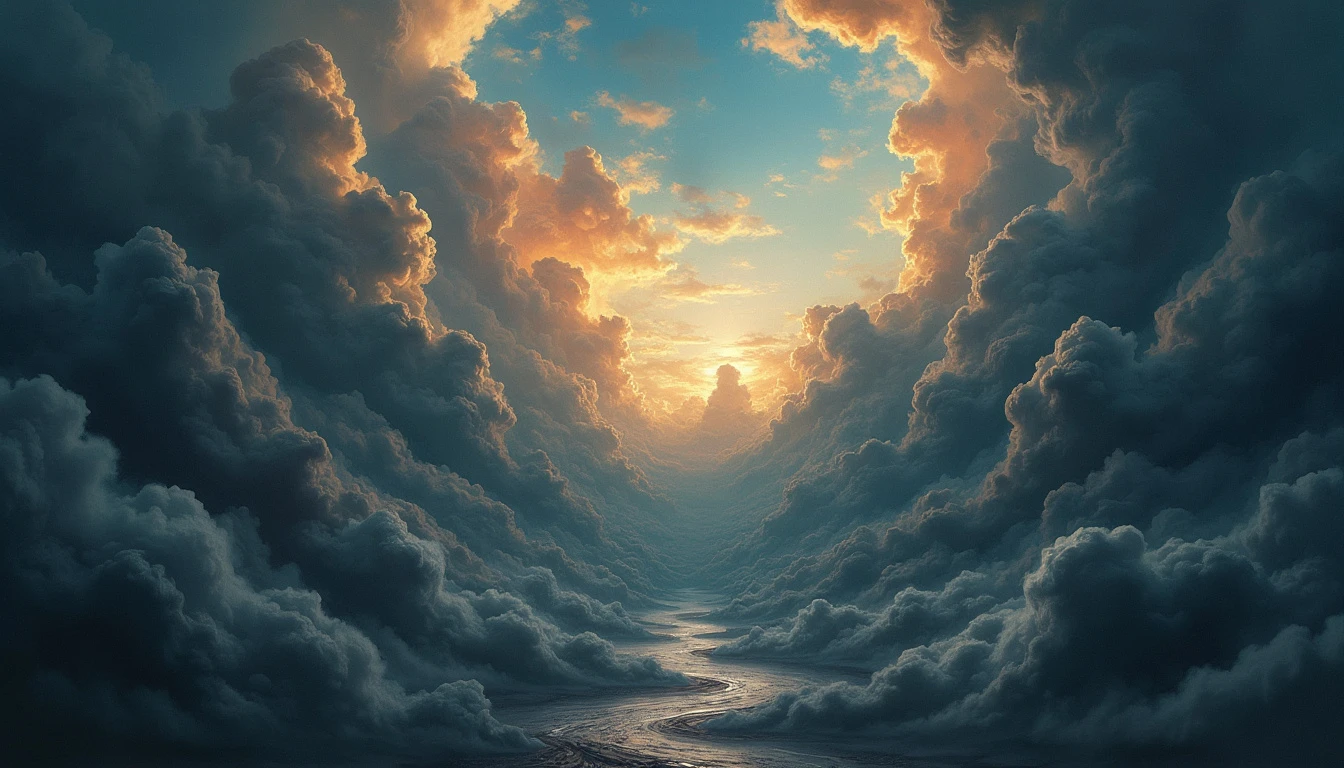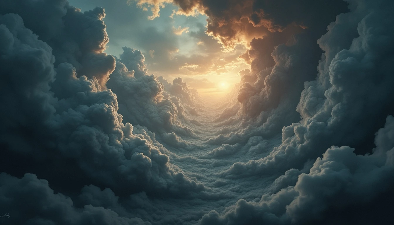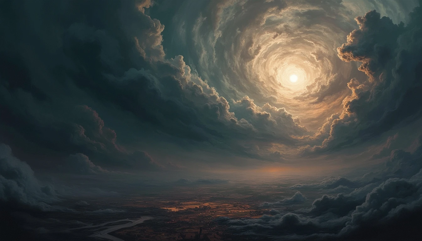 Dark and sufficated painting Theatrical Epic backdrop of an Infernal Epic sky. Only an infinite, dark sky with violent, swirling clouds, Fear and vertigo., chaos. No ground, no foreground, no landscape, just the ominous, hellish sky filling the entire background. Ultra wide angle