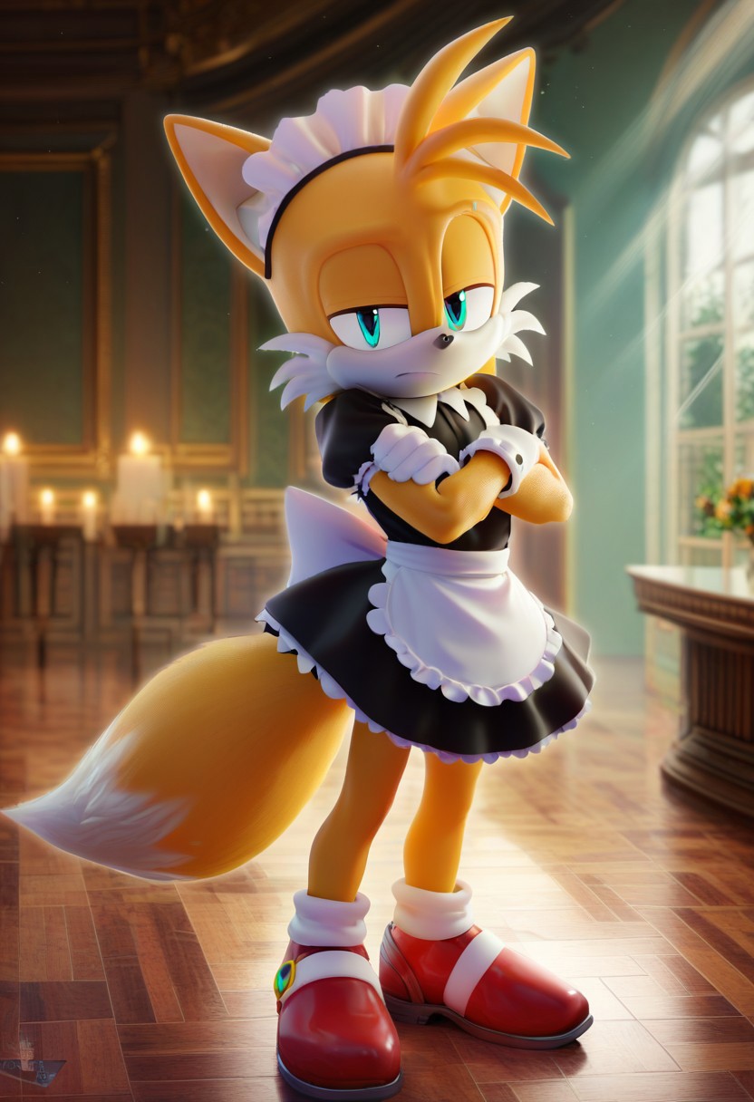 score_9, score_8_up, score_7_up, depth of field, ambient occlusion, bokeh, cel shading, black illustration lines, cinematic lighting, furry, cartoon, solo, Sonic the Hedgehog, white gloves, red shoes, short, cute, Tails the fox, male, standing, maid outfit, arms crossed, eyebrow raised, disappointed,