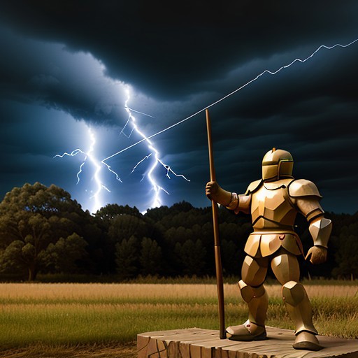 Wooden knight shooting lightning from his hands at power poles, 8k extreme detail, Outside, standing next to a metal machine, realistic, perfect, no mistakes,