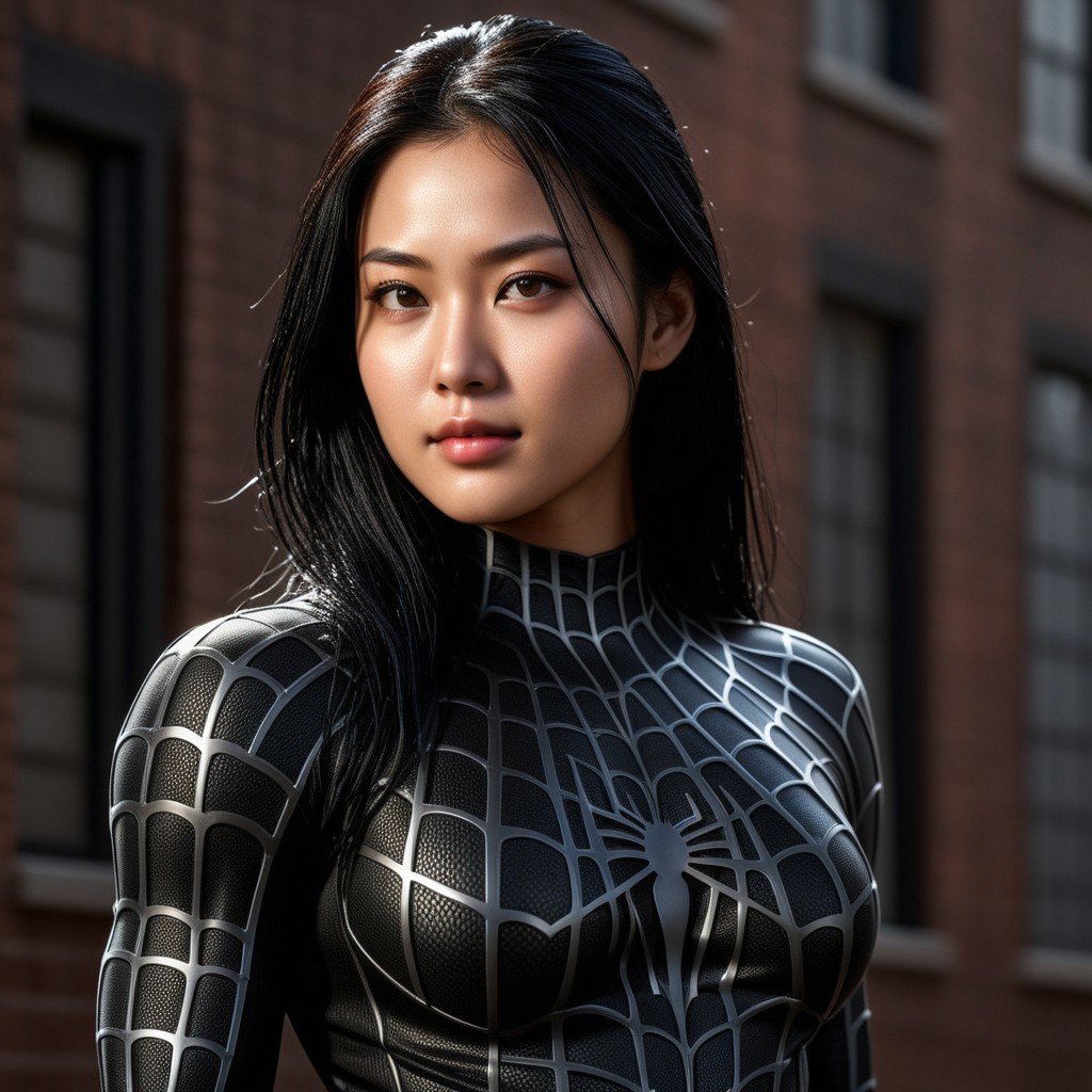 score_9, score_8_up, score_7_up, best quality, realistic, masterpiece, beautiful detail, hyperrealistic, night, ((1girl, woman body, large breast)), amazing detailed full body of a cute korean girl, wearing a realistic and highly detailed black raimi spider-man suit, ((defined muscular girl)), professional model wears ultra - detailed black raimi spider - man suit, ultra - detailed and grained black raimi spiderman suit, suit covered entire body and hand, black spiderman gloves, wet, (black hair, attraction, light smile, dark skin), close up, octane render, highly detailed, volumetric, dramatic lighting, (highest quality:1.1), (HDR:1.3), (top quality, best quality), realistic, high definition, sharp contrast between light and shadow, athletic and fit physique, highly detailed and accurate portrayal, photorealistic rendering, tense and alert atmosphere cinematic scene, cinematic lighting, intricate detail skin and facial texture, lifelike expression, accurate character design, interesting and complex background details,