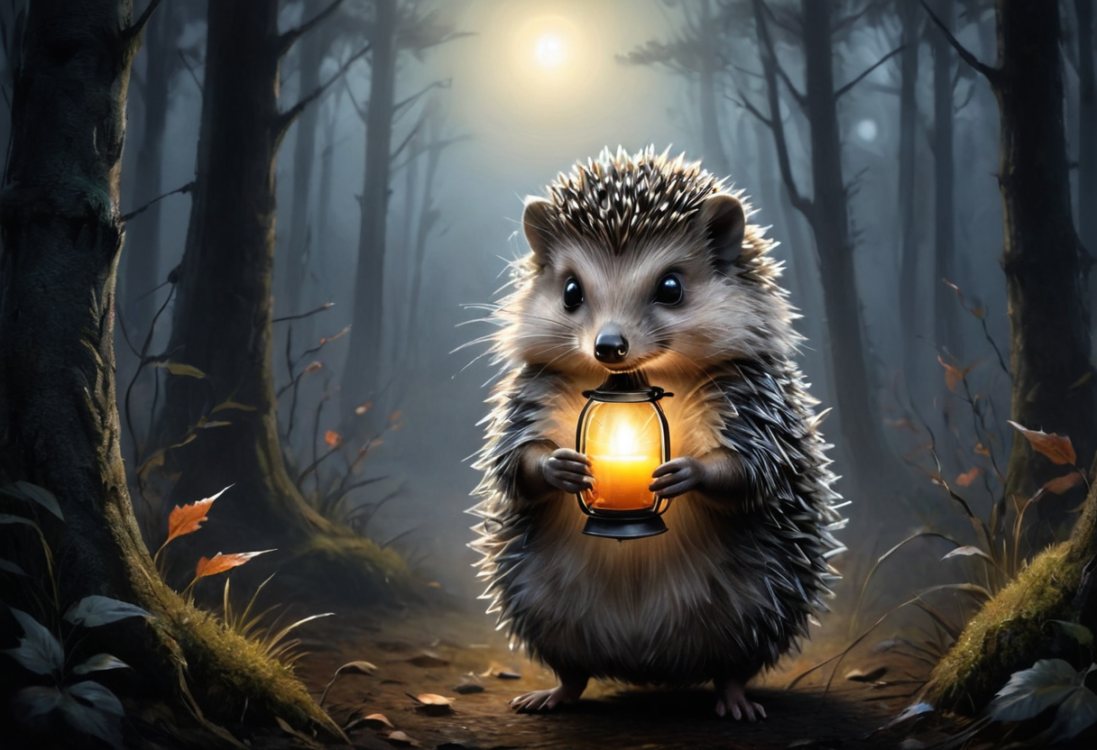 Midjourney, Midjourney style, realism, cinematic quality, Pastel, close-up, High-Angle Shot, A small hedgehog standing alone in a dark, misty forest. The hedgehog is covered in spiky needles and holds a small glowing lantern in its right paw, which illuminates its surroundings. The hedgehog has wide, round black eyes with a gentle, innocent expression. Its tiny legs and arms are barely visible under the thick coat of needles. The overall atmosphere is mysterious and melancholic, with soft, diffused lighting. The foggy background creates a sense of depth and isolation, with dark, indistinct trees barely visible in the distance