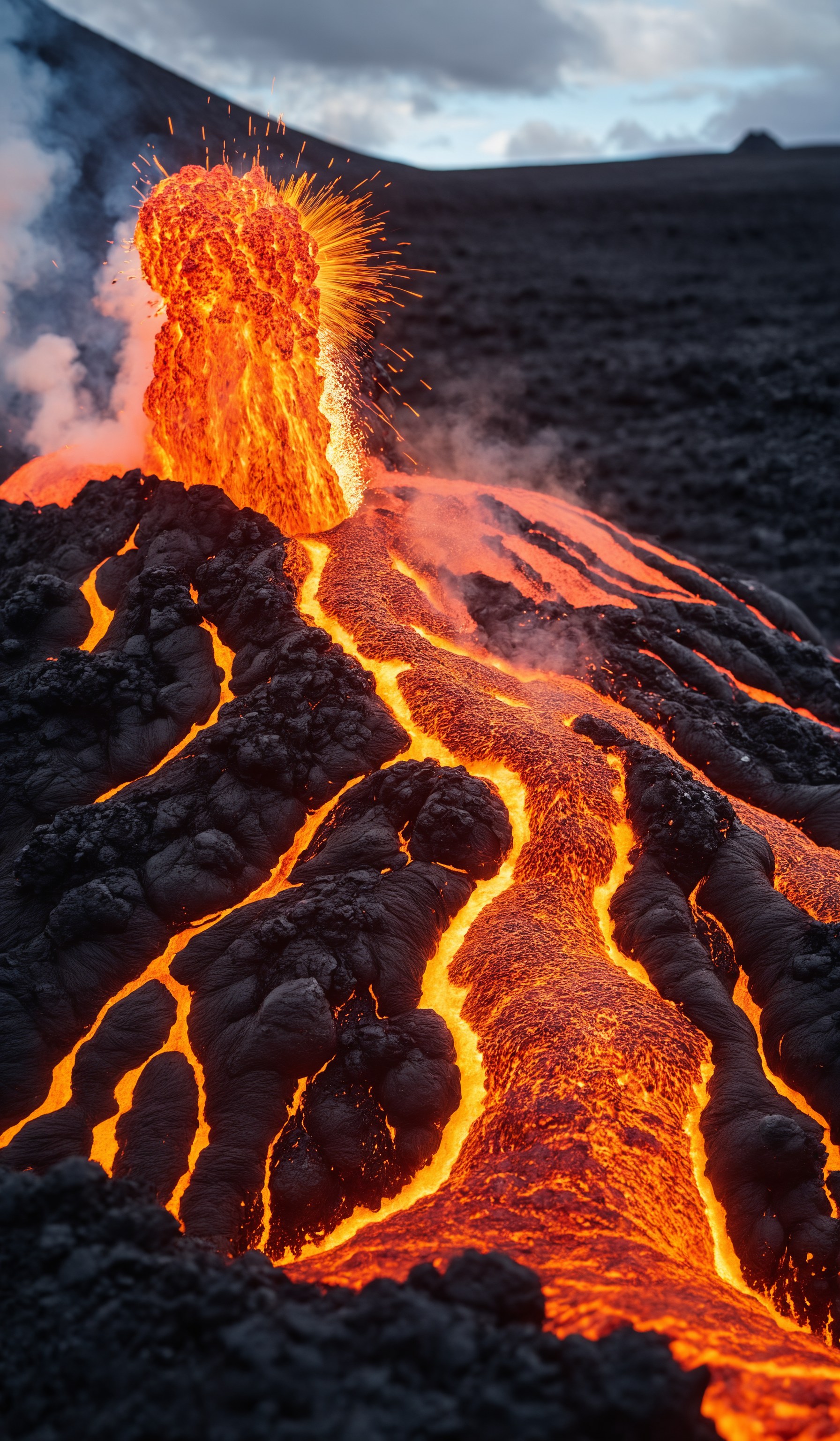 Close-up explosion of fresh lava flowing from volcano eruption in Geldingadalur, Iceland., copy space, design template, breathtaking photograph, dramatic light, award-winning, professional, highly detailed . 35mm photograph, film, bokeh, professional, 4k ,minimalistic, daylight, warm atmosphere, <lora:add-detail-xl:1>, cinematic look, <lora:SDXLHighDetail:0.3>
