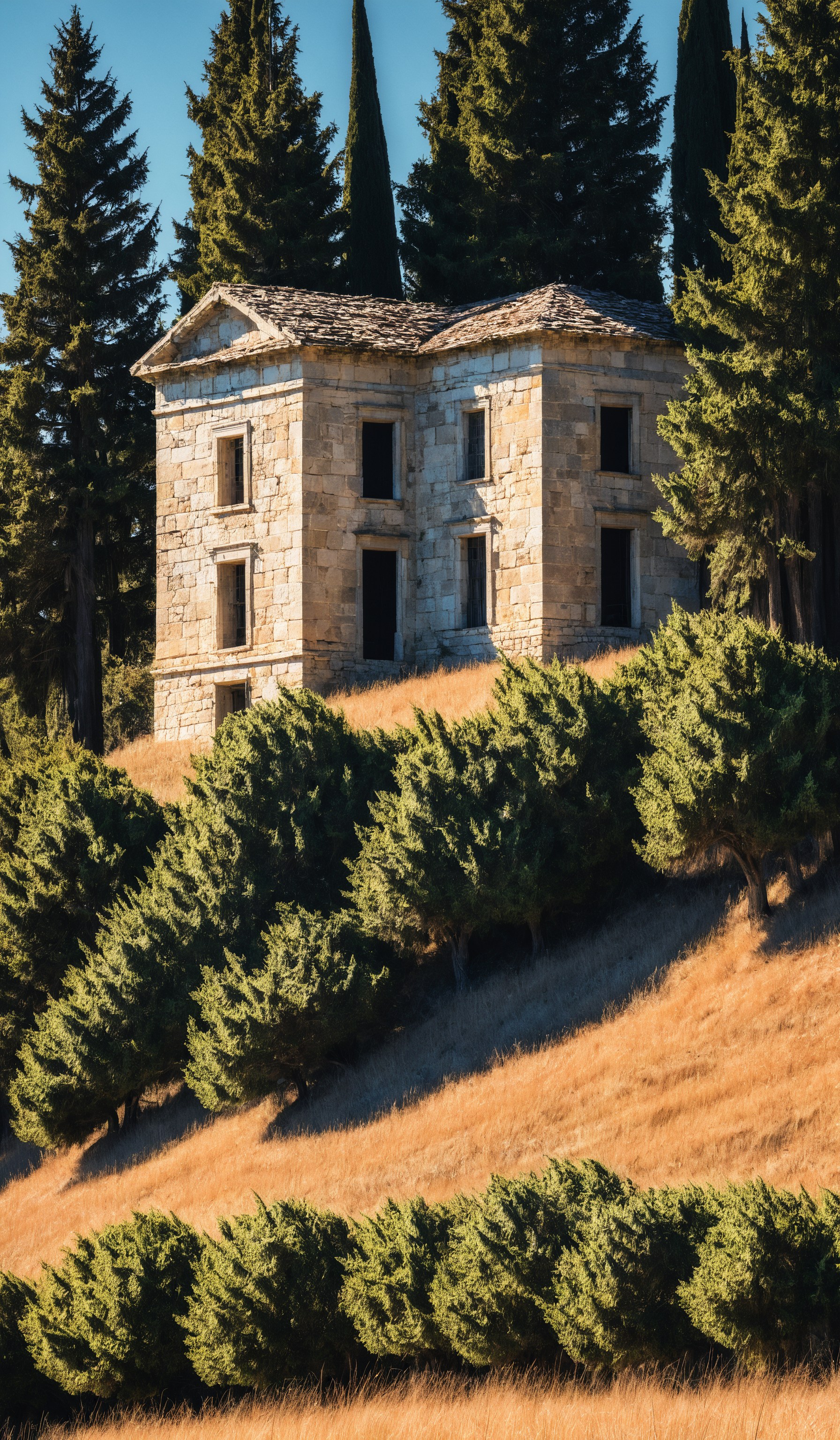 Abandoned stone building next to cypress trees on hillside road, breathtaking photograph, dramatic light, award-winning, professional, film, cinmatic look, film grain, minimalistic, <lora:add-detail-xl:1>, <lora:SDXLHighDetail:0.3>