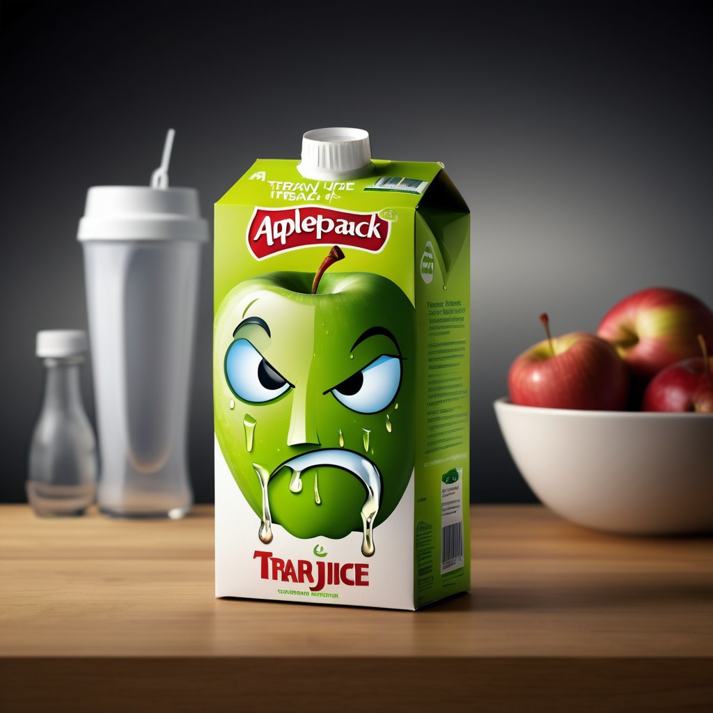 Advertisement print of a tetrapack With applejuice, Logo on tetratpack (crying-apple-face)++ , tetrapack stands on kitchentable, interesting background, dramatic lighting
