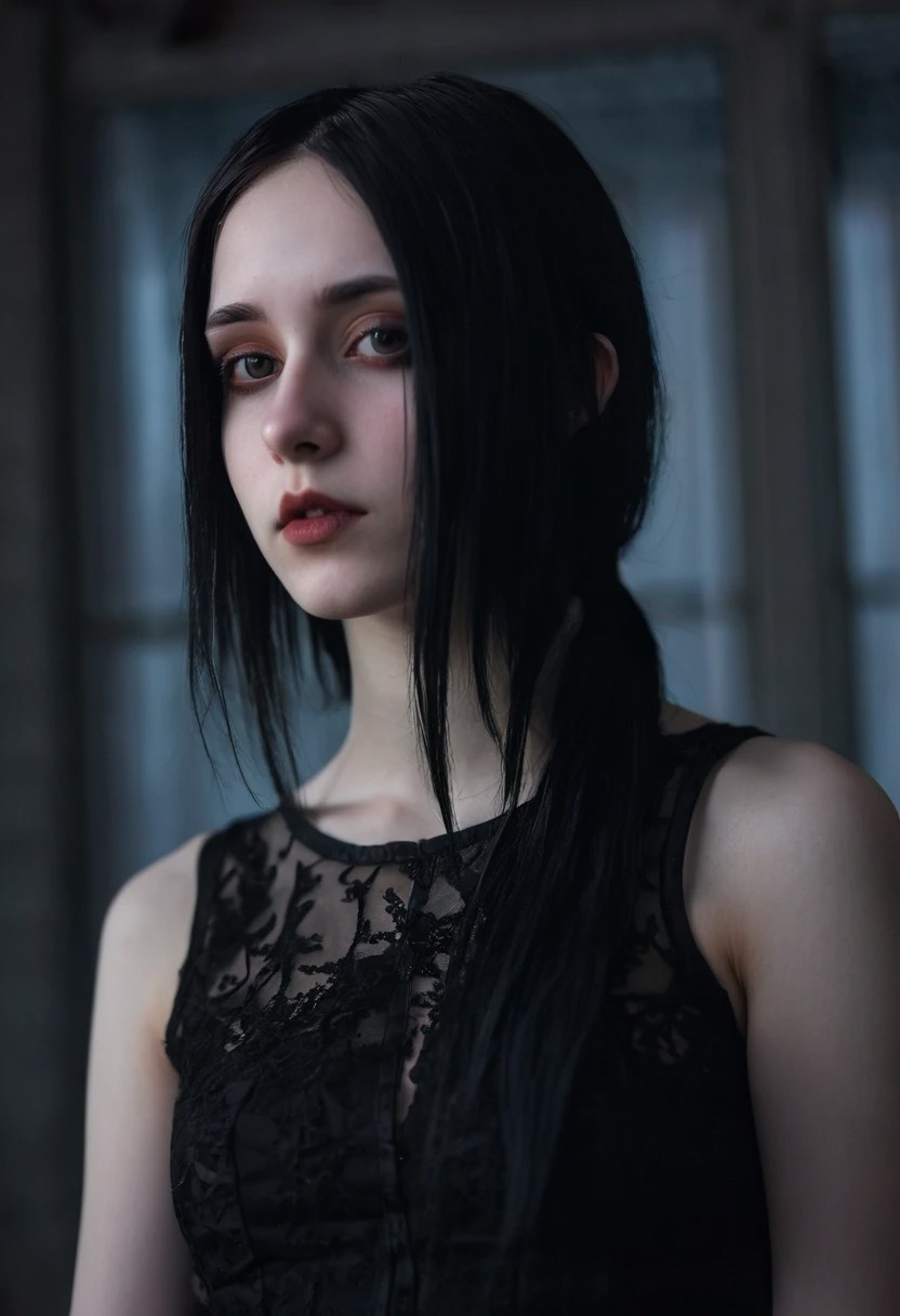 (((top-priority))), real-life, goth-girlfriend, split ambient twilight light, shallow focus, realistic shadows, ideal, vellus hairs, best image, best quality, depth of field, perfect composition, suggestive
