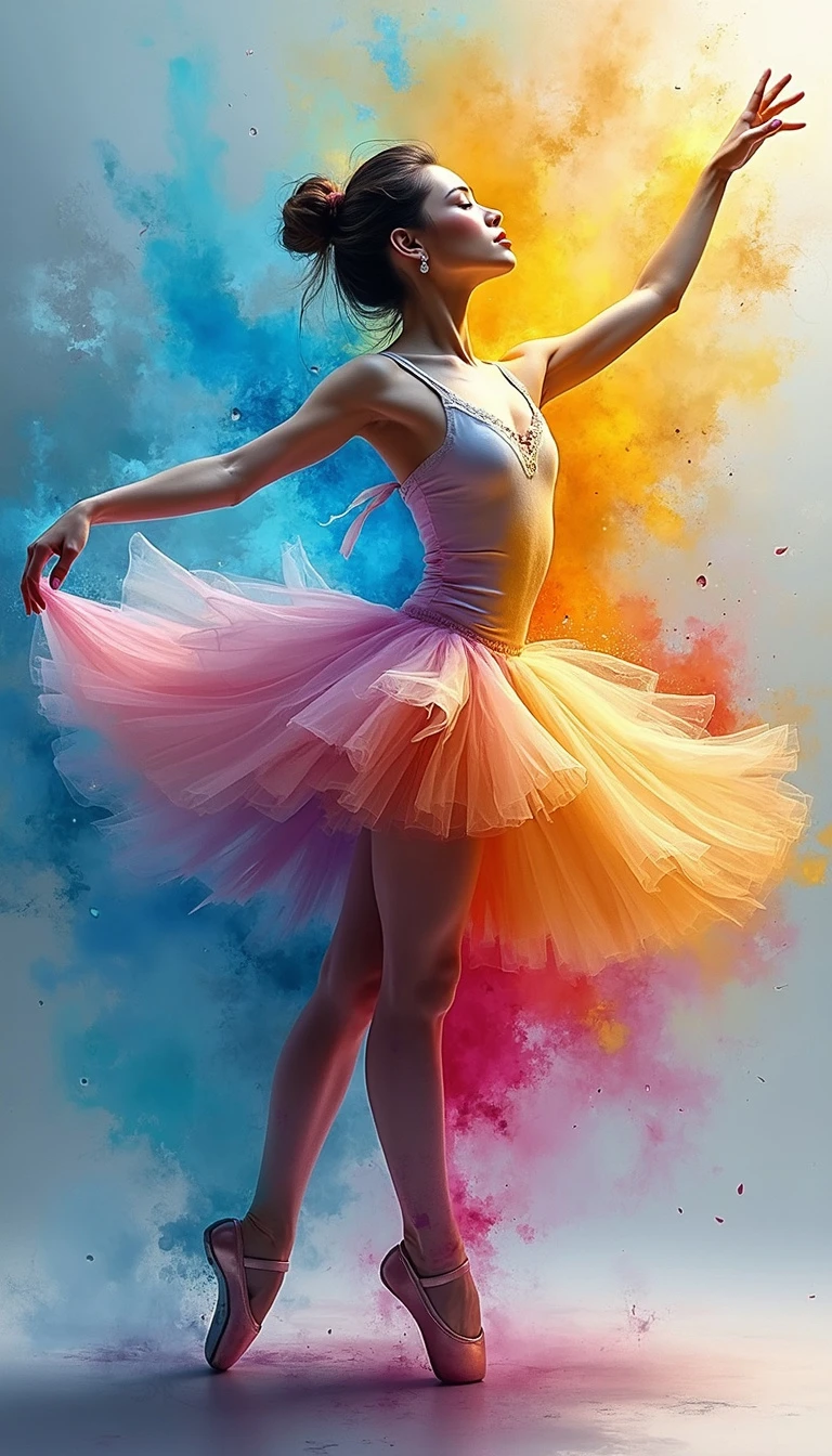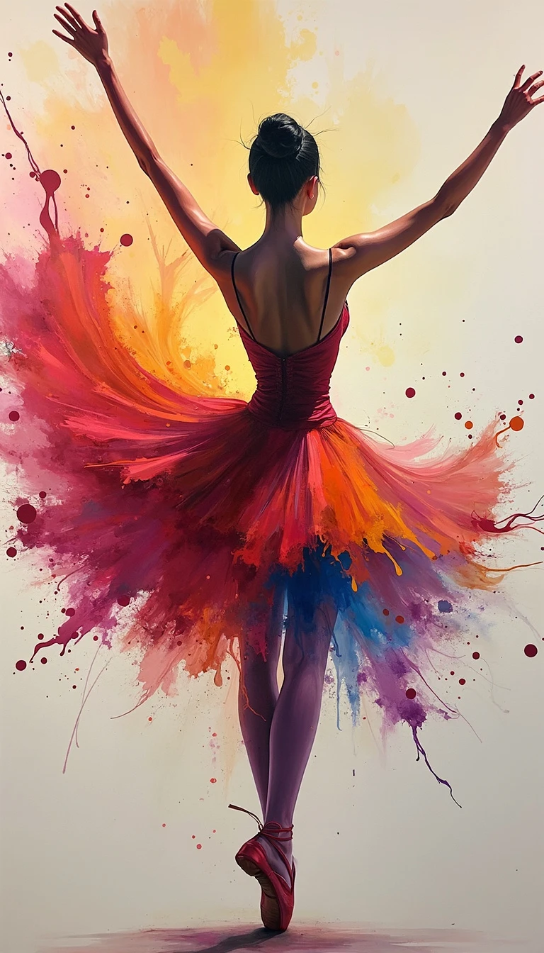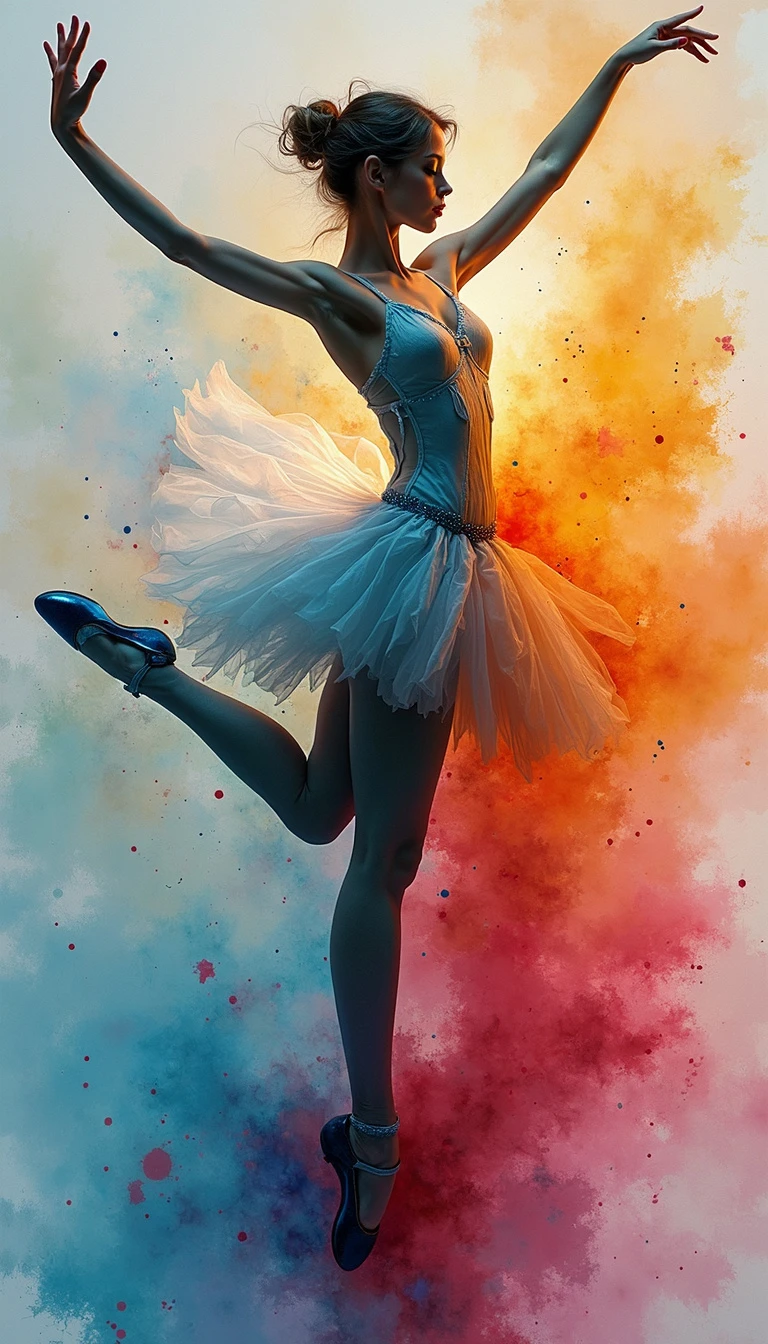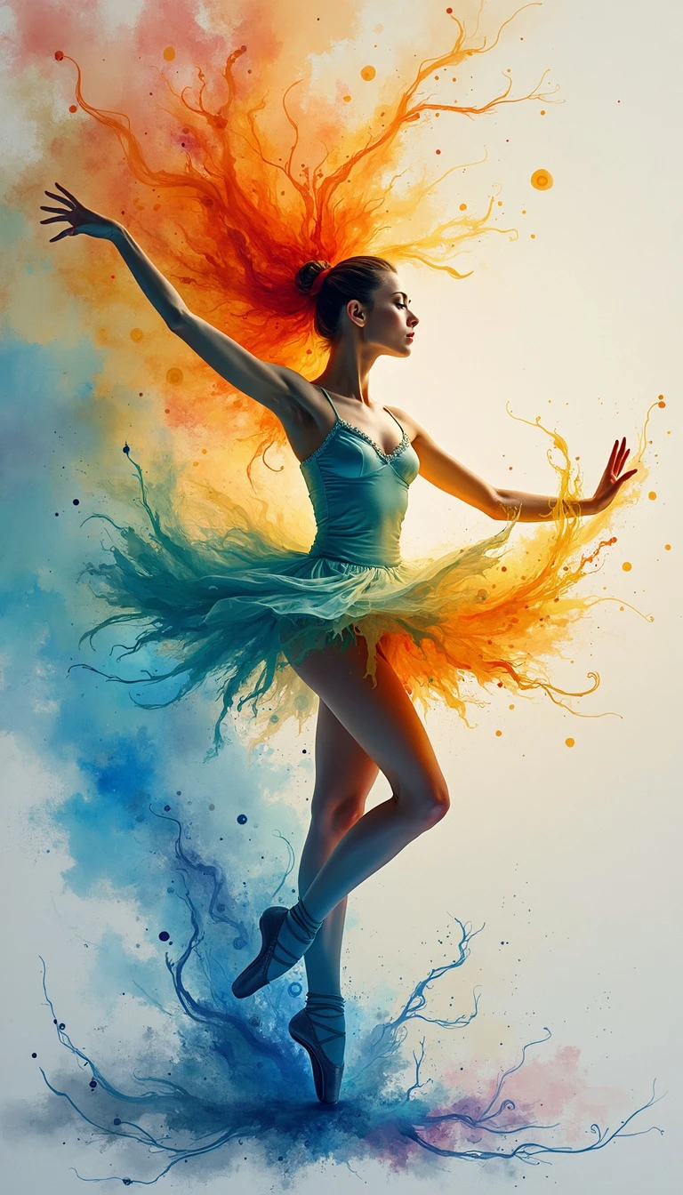 "An abstract and mesmerizing portrayal of a female ballet dancer, infused with vibrant, bright colors that evoke a sense of magic and mystery. The artwork is inspired by the fluidity and expressive nature of watercolor paintings, where the colors blend and flow seamlessly together. The dancer's elegant form is subtly woven into the swirling hues, creating an ethereal and dreamlike atmosphere. The painting captures the essence of the dancer's passion and grace, with bold splashes of color that symbolize her presence in a world of fantasy and wonder. The overall effect is both dynamic and enchanting, making the artwork a striking tribute to the art of ballet." By Sasan