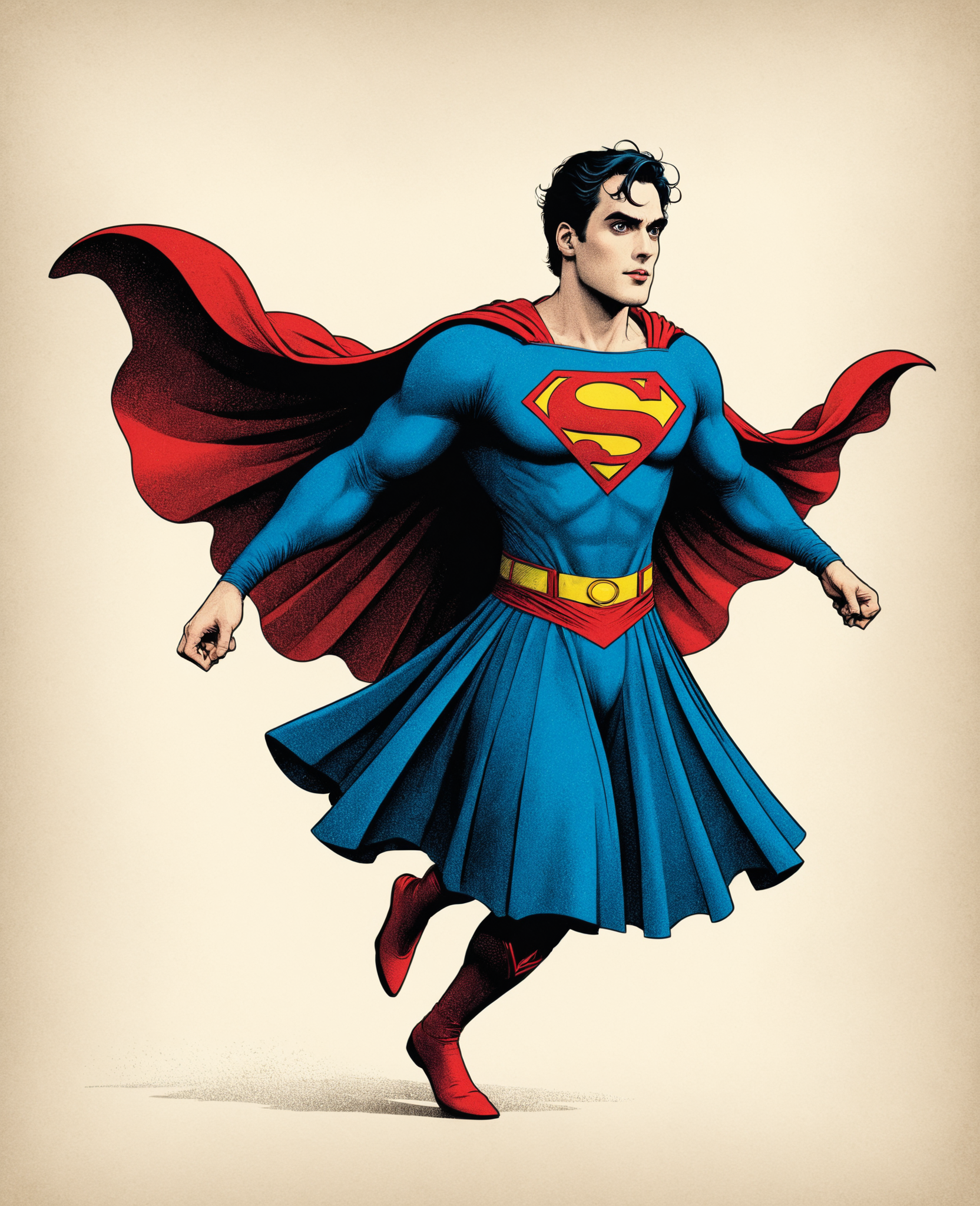flying superman, vector, illustration, flat shading, grainy texture, grain Minimalist vector graphic style illustration,beautiful and dreamy,inspired by Tim Burton's cartoon, with dance skirt 'tutu' <lora:grainy-v1:0.7>