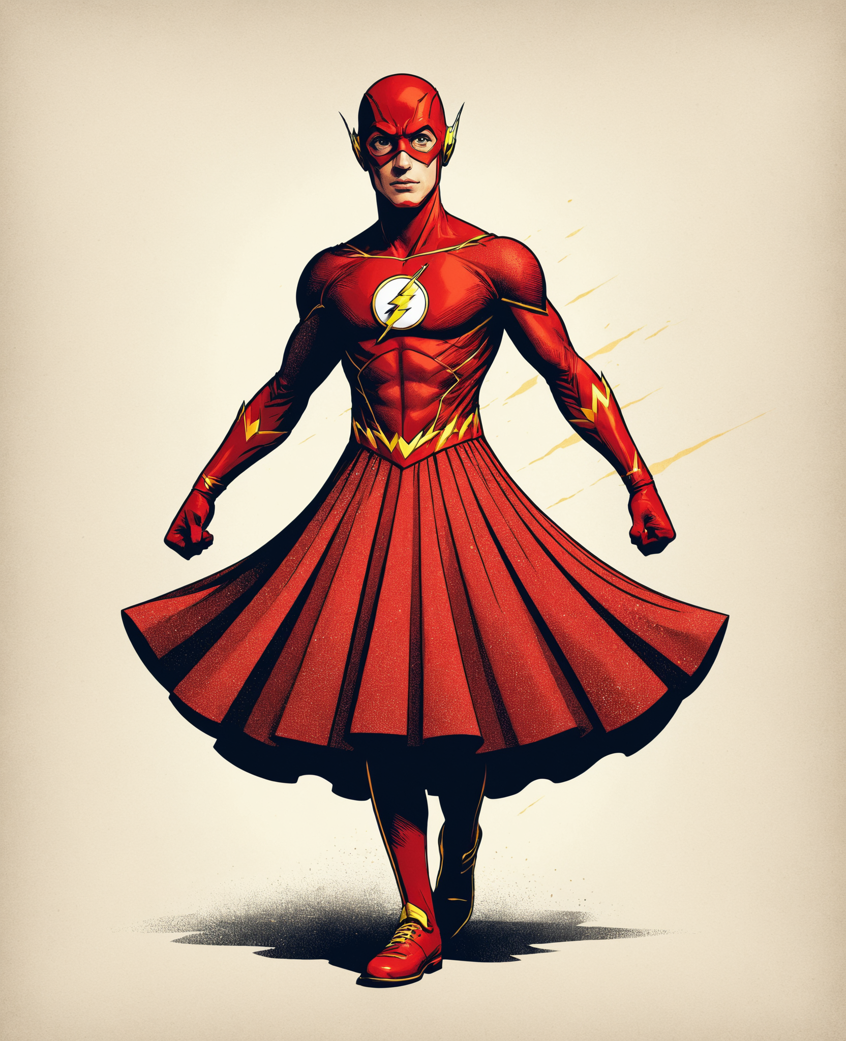 The Flash, superhero , DC Comics, vector, illustration, flat shading, grainy texture, grain Minimalist vector graphic style illustration,beautiful and dreamy,inspired by Tim Burton's cartoon, man with dance skirt 'tutu', dress <lora:grainy-v1:0.7>