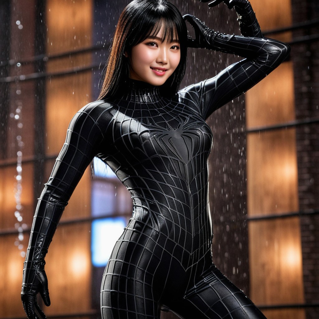 score_9, score_8_up, score_7_up, best quality, realistic, masterpiece, beautiful detail, hyperrealistic, ((1girl, woman body, large breast)), amazing detailed full body of a cute korean girl, cute face, wearing a realistic and highly detailed black raimi spider-man suit, ((defined muscular girl)), professional model wears ultra - detailed black raimi spider - man suit, ultra - detailed and grained black raimi spiderman suit, suit covered entire body and hand, black spiderman gloves, wet, (black hair, attraction, light smile), dancing on a stage, octane render, highly detailed, volumetric, dramatic lighting, (highest quality:1.1), (HDR:1.3), (top quality, best quality), realistic, high definition,