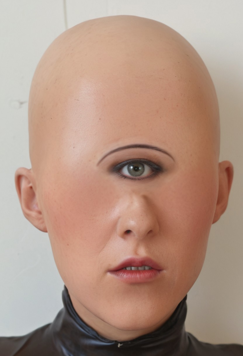 cyclopsgirl, thinmonobrow, living head of a beautiful girl,bald head, no hair, mannequin head, natural skin, eyes open, turned 60 degrees from viewer, looking toward viewer, digital art, hyperrealistic, fantasy, dark art, artstation, highly detailed, sharp focus