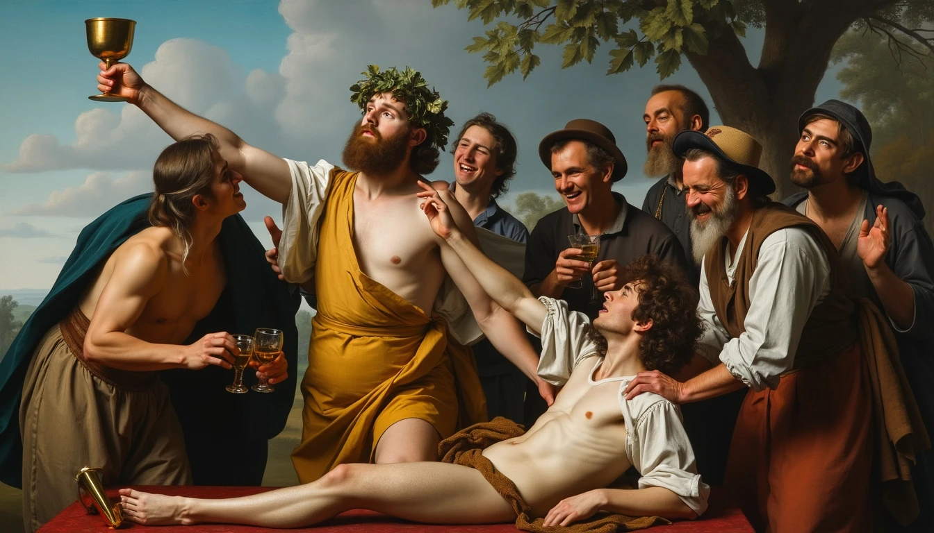 Professional hyperrealistic photography recreating the painting "The Triumph of Bacchus," also known as "The Drunkards," is a work by the Spanish painter Diego Velázquez, depicting a mythological scene fused with elements of daily life of his time. The painting shows nine characters gathered in a country setting. At the center of the composition is Bacchus, the Roman god of wine, crowned with vine leaves. Around him, a group of peasants and rustic-looking men interact in a celebration of drink and joy. Bacchus (central figure): He is a fair-skinned young man . His head is adorned with a crown of vine leaves, and he holds a golden cup aloft, suggesting that he is toasting or celebrating. His expression is serene, almost absent, looking forward, while the other men surround him. Peasants: To the right of Bacchus, a middle-aged man, with a beard and a smiling expression, is in the foreground. He is wearing a yellow vest and white shirt, and leaning forward, as if he were talking to another character or approaching Bacchus. Another man at his side, wearing a brown cloak and a grey beard, is also looking on with interest. Further to the right, there are two other men, one of them pointing with a finger towards Bacchus, and the other watching with a curious gesture. Figure to the left of Bacchus: A young man, also crowned with vine leaves, is lying down, holding a golden cup in his left hand. This character seems relaxed and smiling, taking part in the celebration. Figures in the background and to the right: Three more men, one of them wearing a wide hat that partially hides his face. Another character, wearing a dark cloak, seems to be leaning his head towards his hand, covering his eyes or laughing discreetly. Atmosphere and details: The background of the painting suggests a rural landscape with a cloudy sky, although it is not very detailed. The light in the painting comes mainly from the front left, illuminating the central figures of Bacchus and the man in the yellow vest, creating dramatic contrasts in the fabric and the faces of the characters. The predominant colors are warm tones such as browns, golds, and ochres, with touches of red and pink in the fabrics. Technical elements to recreate the photograph: Lighting: Use soft, natural lighting that simulates diffuse sunlight coming from the left side. Use a reflector to soften the shadows on the faces and bodies of the characters, especially highlighting Bacchus and the man to his right. Costume and accessories: The characters should wear rustic and simple clothing that imitates the style of the 17th century, such as linen shirts, vests, capes, and crowns of vine leaves for Bacchus and the young man to his left. (No character should wear a hat: 1.3). Include details such as wine jugs, golden goblets, and terracotta elements to recreate the festive and country atmosphere. (No anachronistic elements should appear: 1.3) Poses and expressions: Instruct the models to adopt relaxed poses but with a sense of interaction and camaraderie. Bacchus should have a dominant but relaxed posture, with a serene expression. The other characters should show smiles, curious glances, and conversational or toasting postures. Setting and background: Place the scene in an outdoor environment, preferably with vegetation and a blurred background that simulates a natural landscape. Use techniques that give the photo realistic authenticity and cancel out the pictorial effect of the background in the painting. Photographic composition: Use a medium focal lens to capture the scene in its entirety, maintaining a sharp focus on the main characters while blurring the details of the background. Keep the frame slightly centred on Bacchus, ensuring that the supporting characters form a semi-circle around him, as in the painting. By following these guidelines, you will be able to recreate a photograph that captures the essence and spirit of Velázquez's "The Triumph of Bacchus", with a modern and realistic approach using live characters and contemporary photographic techniques.