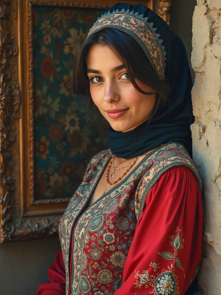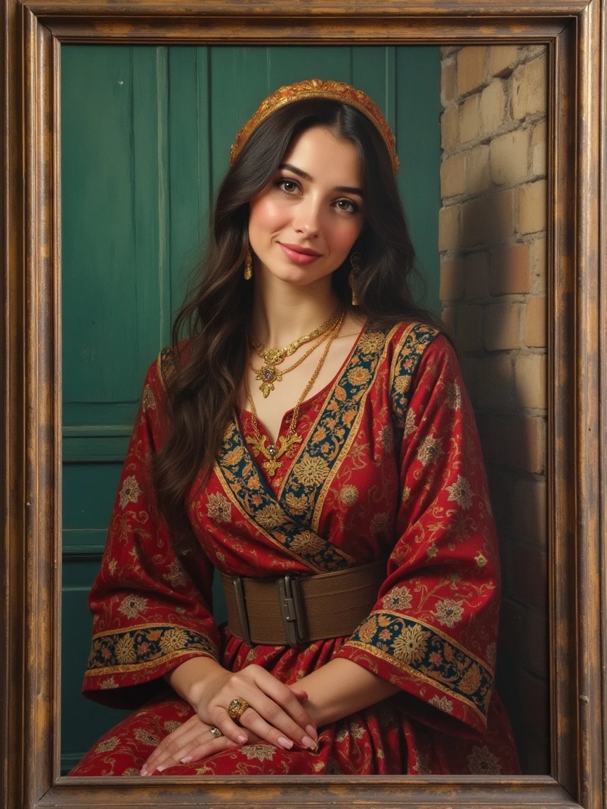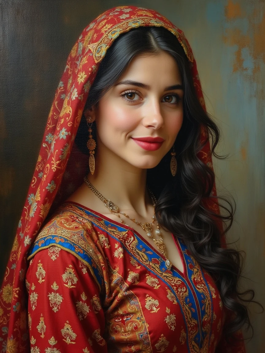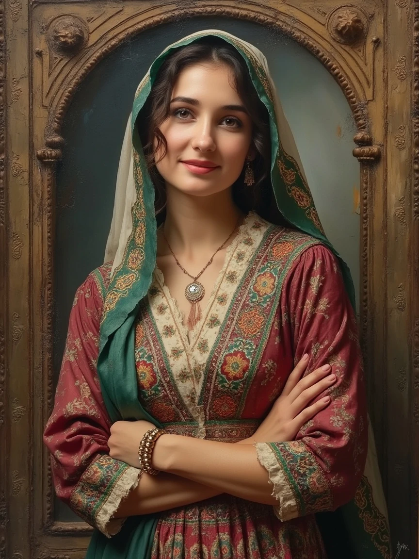 An artistic depiction of a beautiful Persian woman, with usual daily dress with Persian carpet design pattern, In the old photo frame of the art portrait in the gallery, in a local costume while looking at the camera and smiling from different countries, art painting, oil painting, impressionist and looking at the camera with a kind smile, art oil painting style