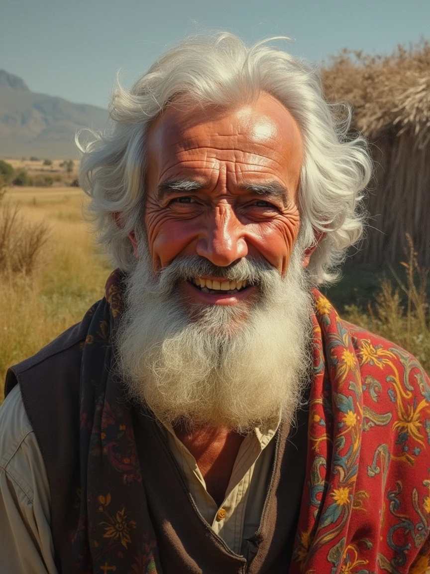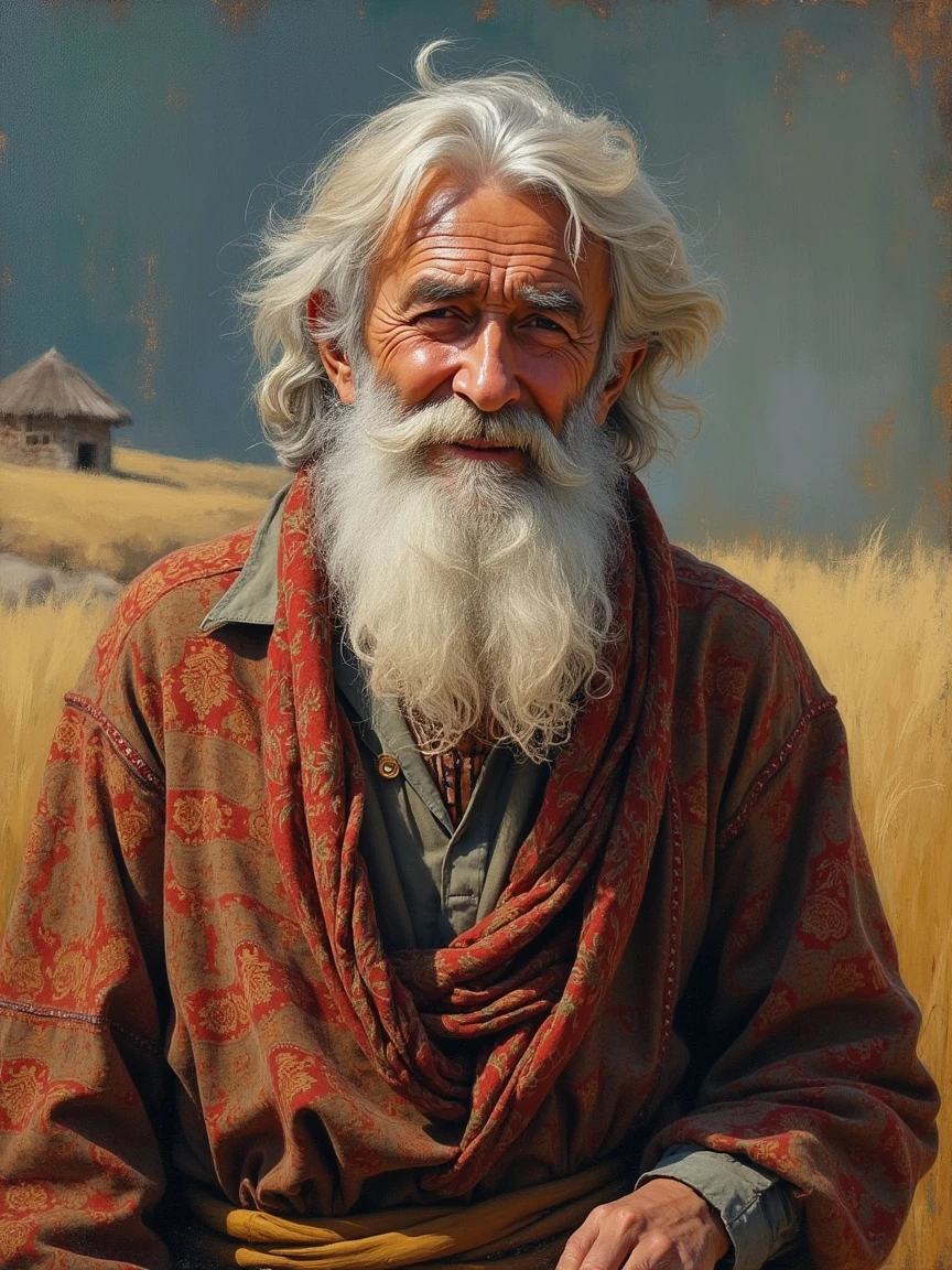 An artistic depiction of a Kind old man with shepherd's white hair and beard on a farm , with usual daily dress with persian carpet design patern , in a local costume while looking at the camera and smiling from different countries , art painting , oil painting , impressionist and looking at the camera with a kind smile , art oil painting style