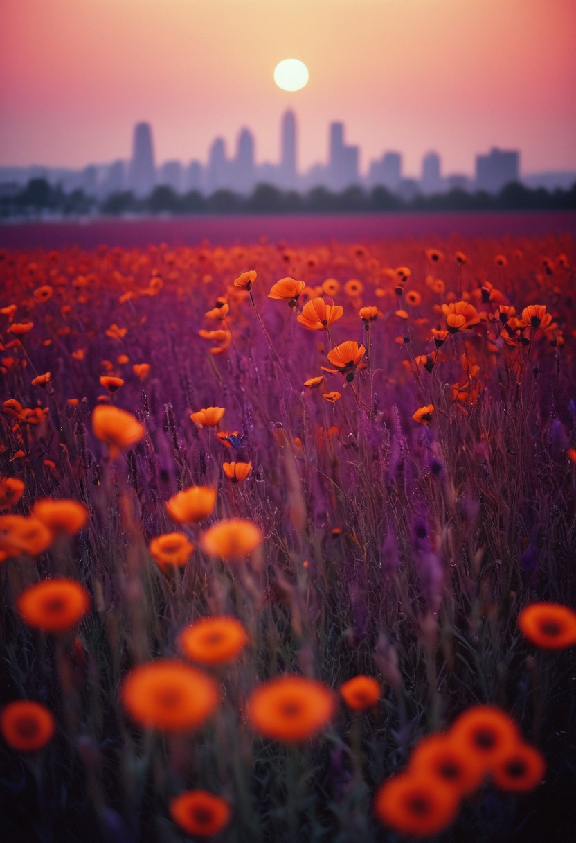 Photograph, a beautiful red, orange, and purple field, under a red sun, with city lights in the far distance, bokeh, beautiful, analog film grain, detailed