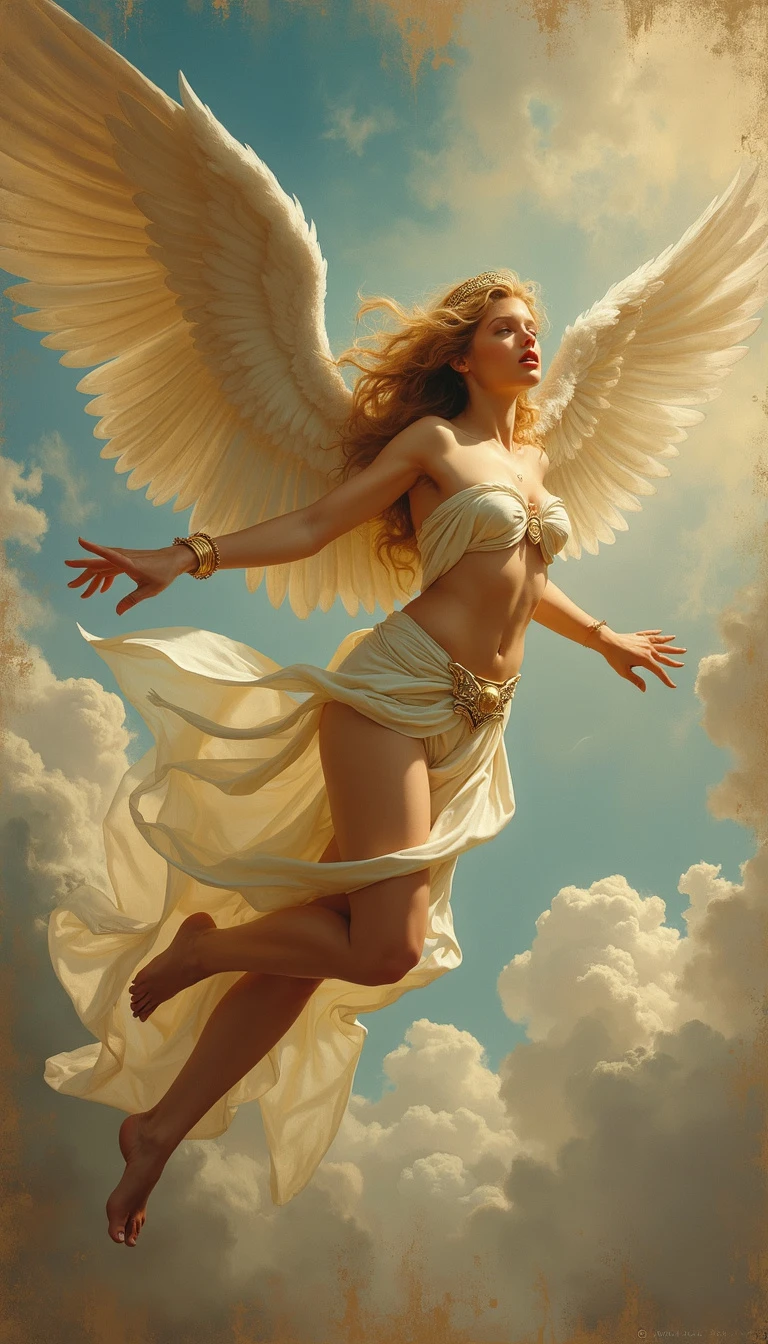 Frank Frazetta style painting, A beautiful female angel flies in the air