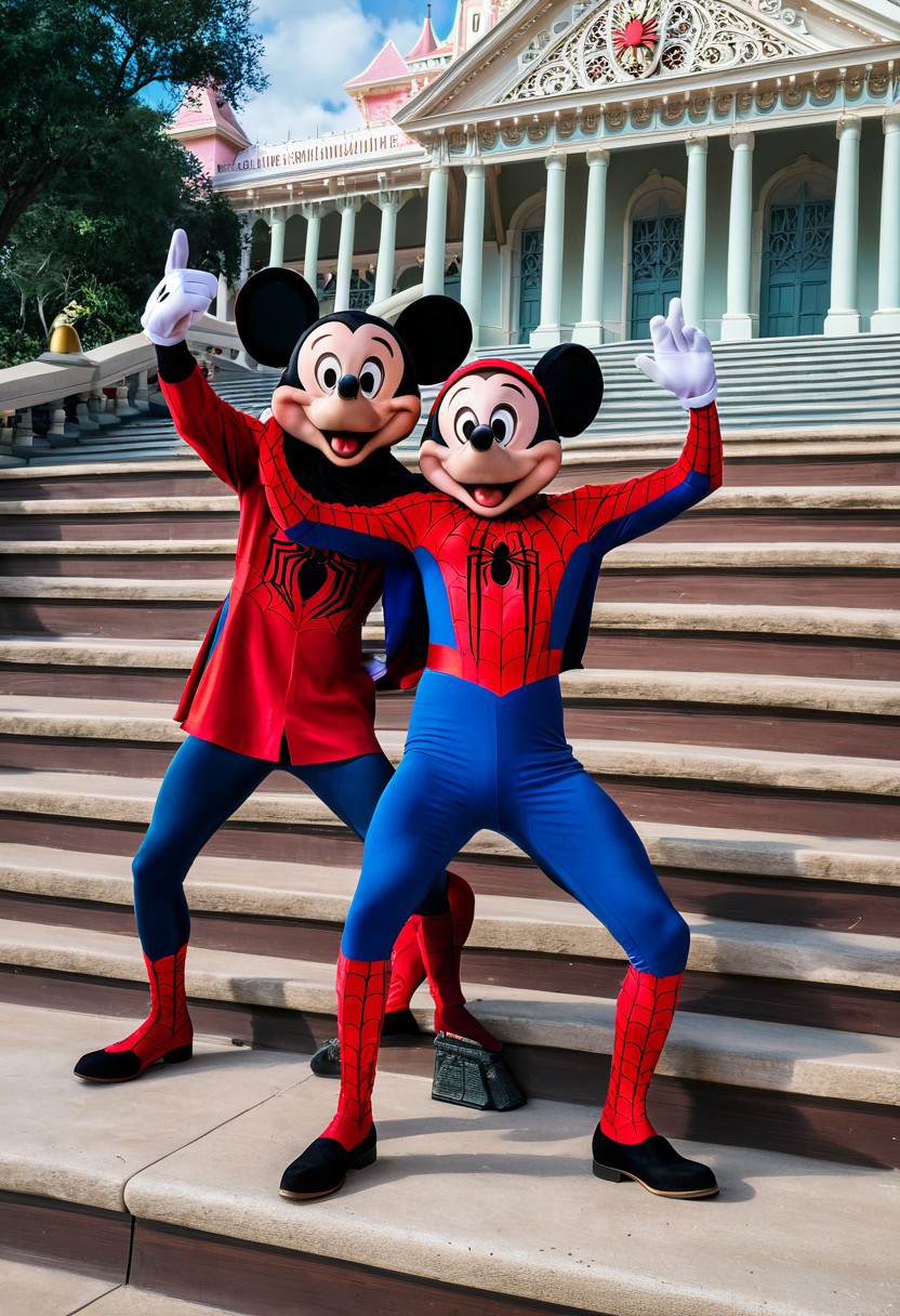 Mickey Mouse Dressed as Spider-man, Dances With minnie Mouse outside on the steps of the magic kingdom, 50% animated, classic disney, classic marvel comics, 1980's designs