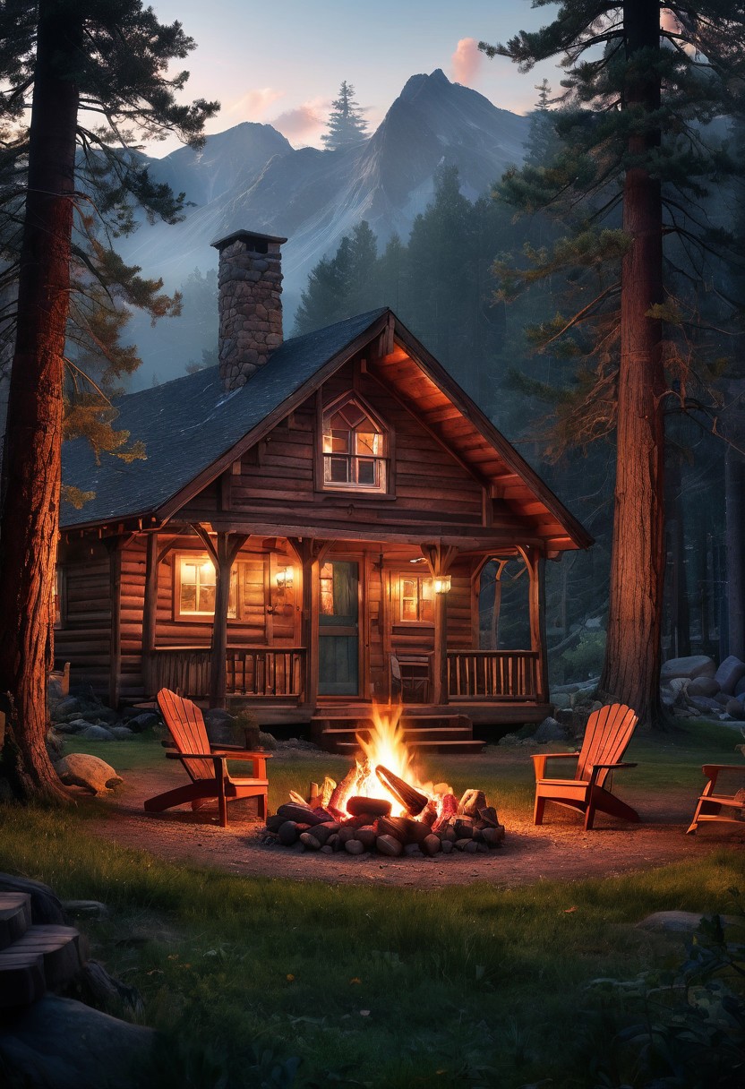 Mountain Retreat: A cozy cabin nestled in the mountains, surrounded by towering pine trees. A family gathers around a campfire, the light from the fire casting warm tones. Blend the styles of Ivan Shishkin, David Kassan, and Richard Estes.