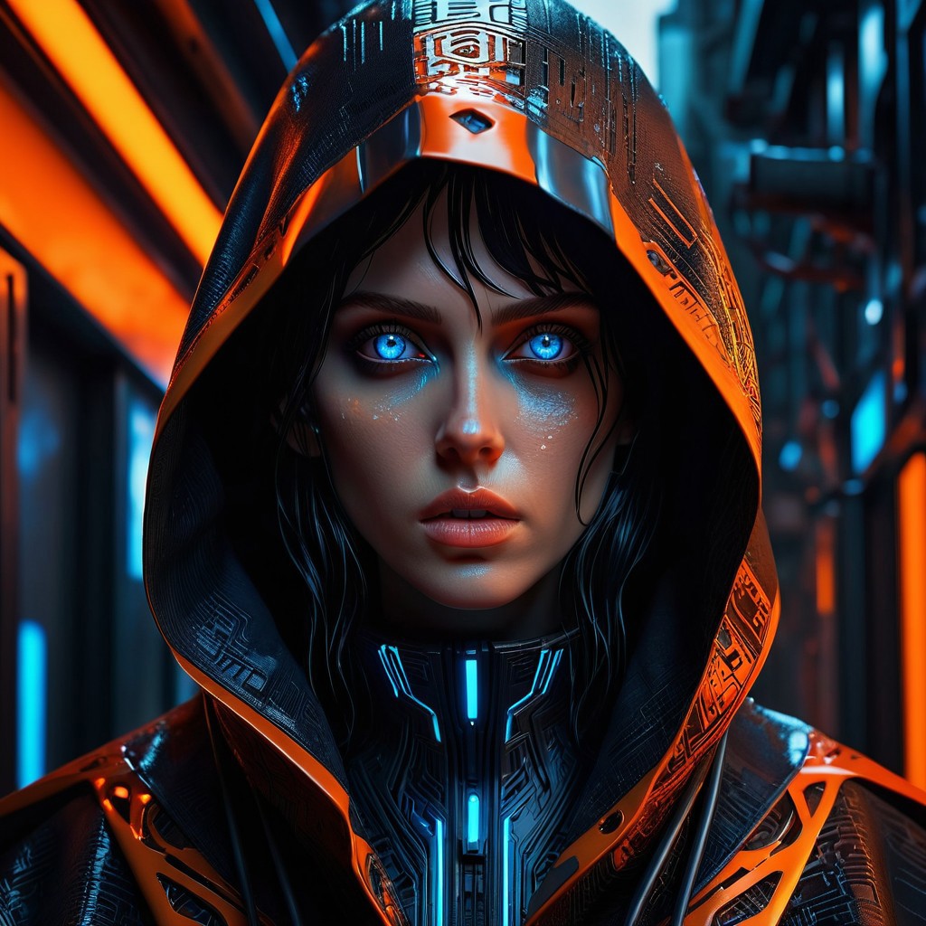 A close-up portrait of a woman with striking blue eyes and dark, wet hair, framed by a futuristic hooded cloak. The cloak has an orange inner lining and is covered with intricate, tech-inspired patterns, giving off a cyberpunk vibe. The lighting is dim and moody, with subtle rain effects adding a dramatic touch. The woman has a small metallic implant or accessory attached to her lower lip, enhancing the futuristic theme. Her expression is intense and focused, creating a powerful and immersive atmosphere in the image. The overall color palette is orange.